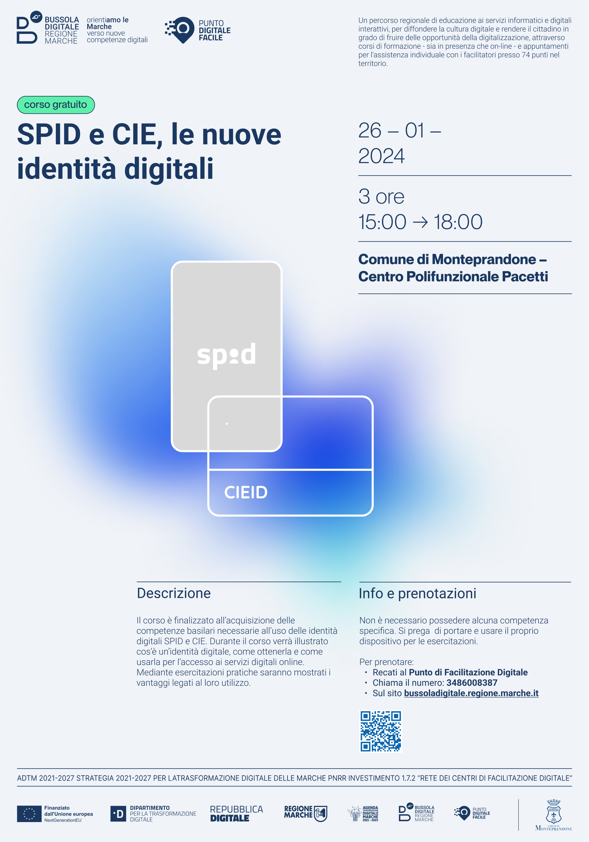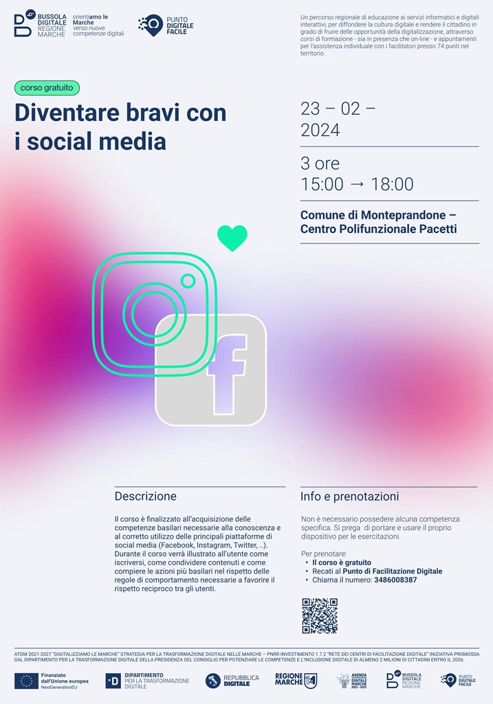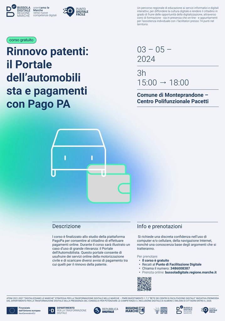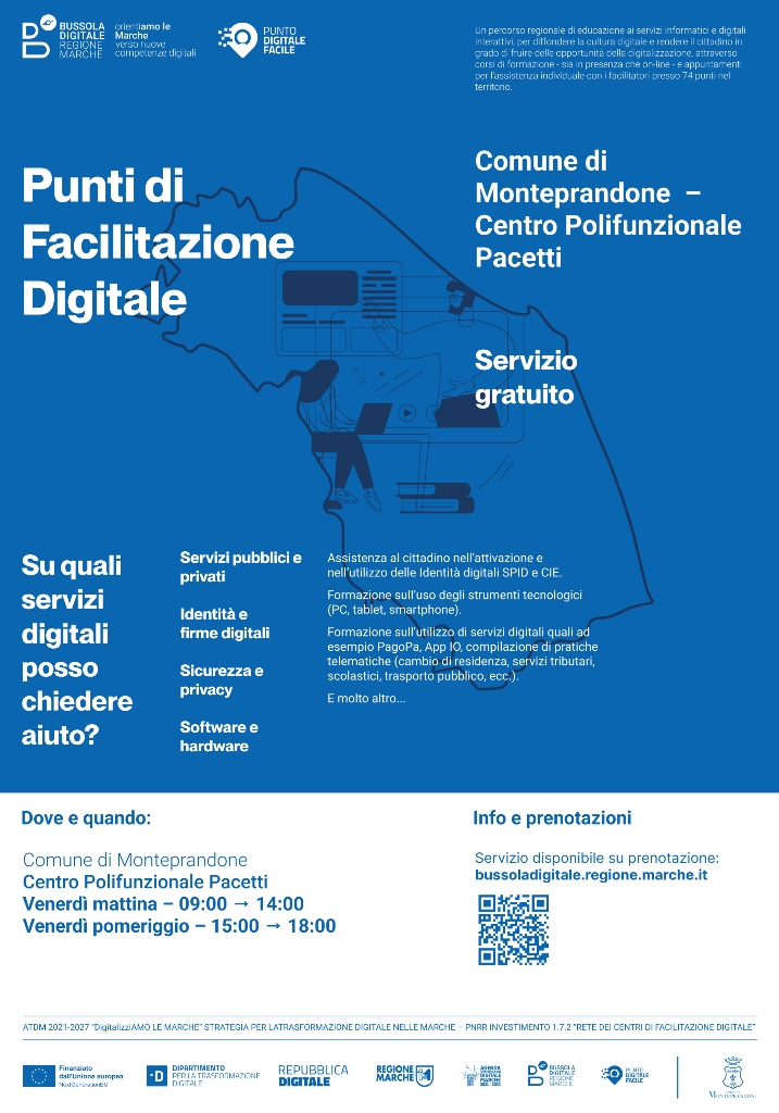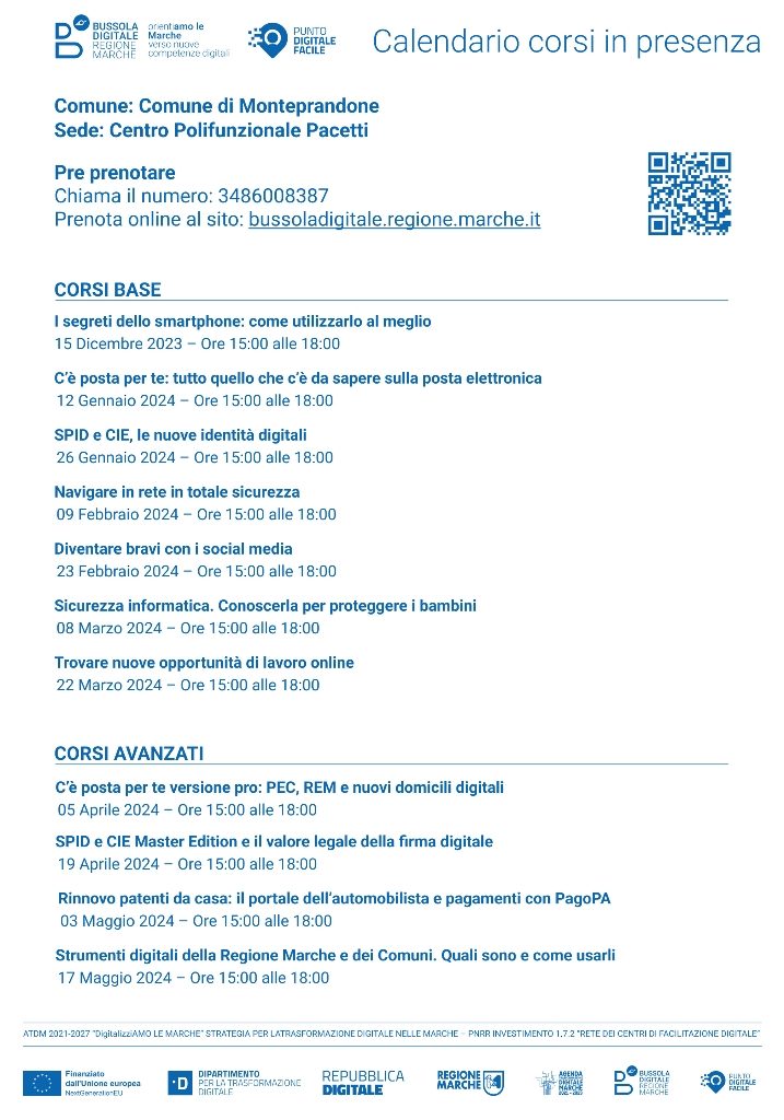 Nell’ambito del progetto “Bussola Digitale: OrientiAMO LE MARCHE”, attuato dalla Regione in virtù di un finanziamento del PNRR di 3,2 mln di euro, che ha permesso di attivare 74 sportelli in tutte le Marche, uno dei quali a Monteprandone, a cui i cittadini posso rivolgersi per chiedere aiuto nell’accesso ai servizi online, è in partenza un ciclo di corsi in programma dal 15 dicembre 2023 al 15 marzo 2024 per implementare le competenze digitali dei cittadini.