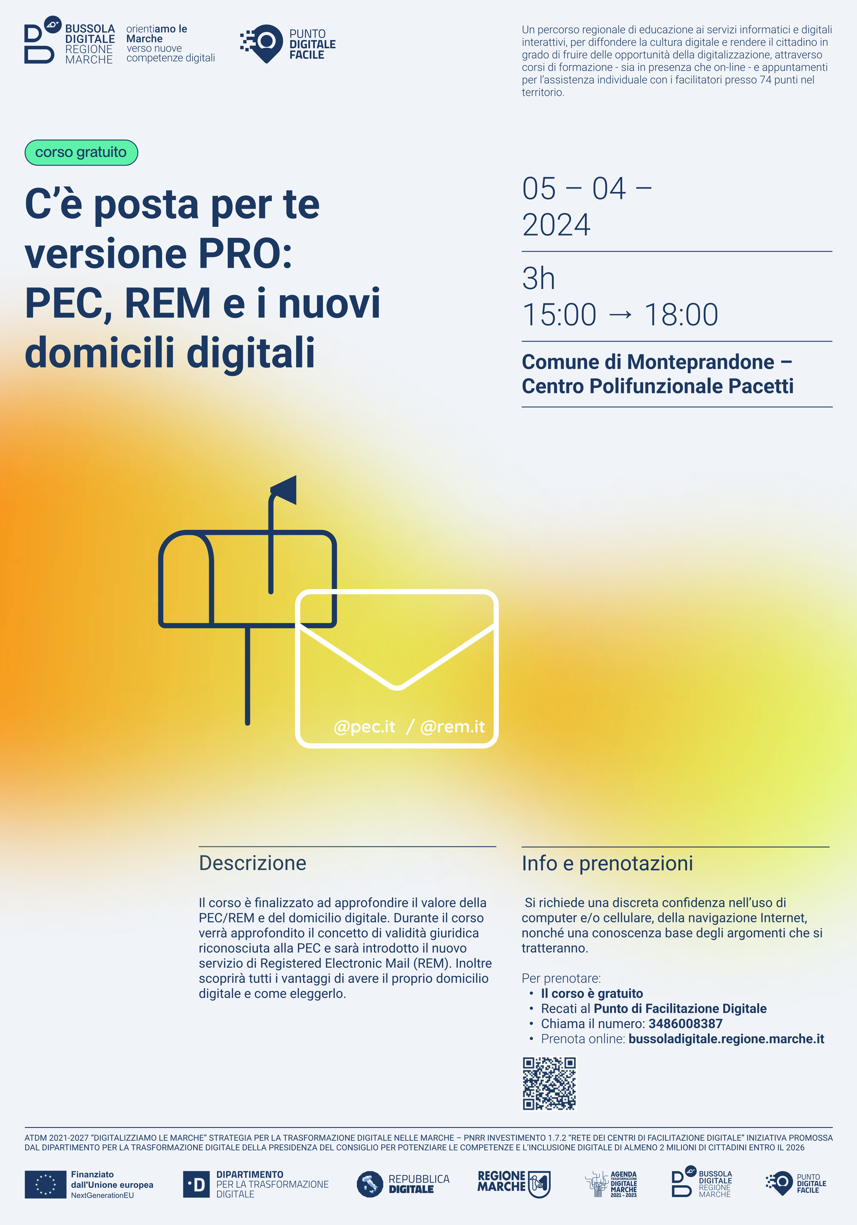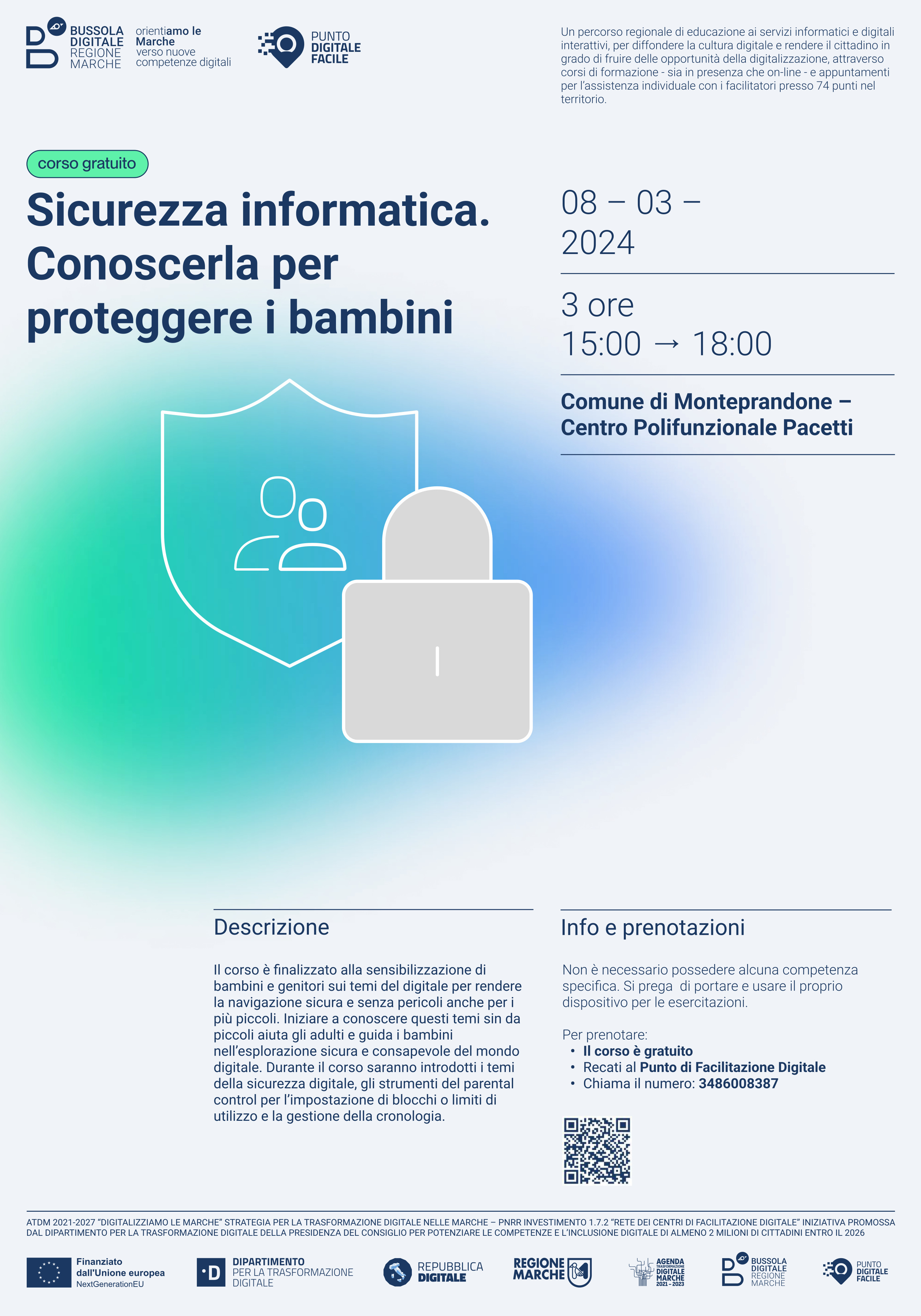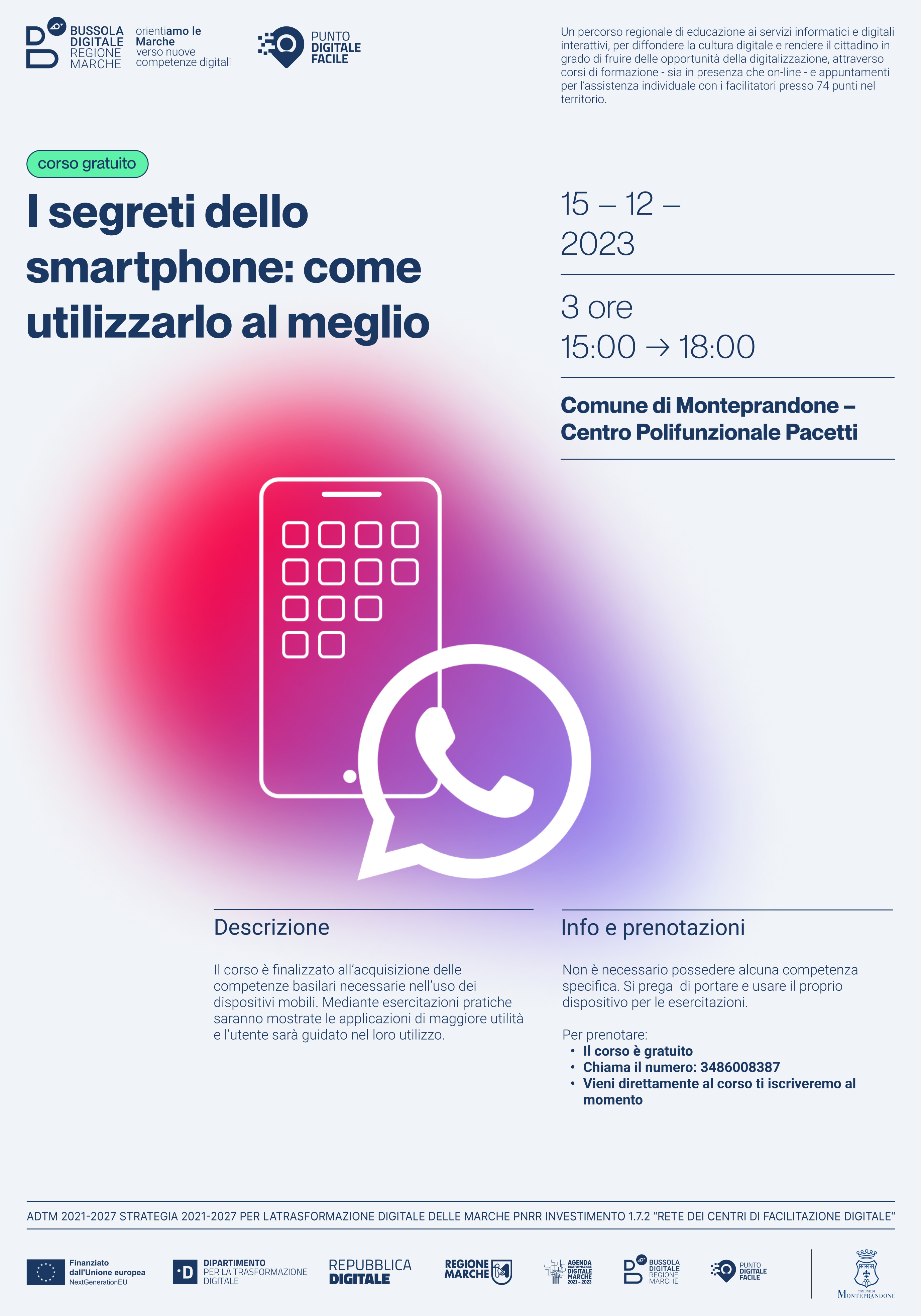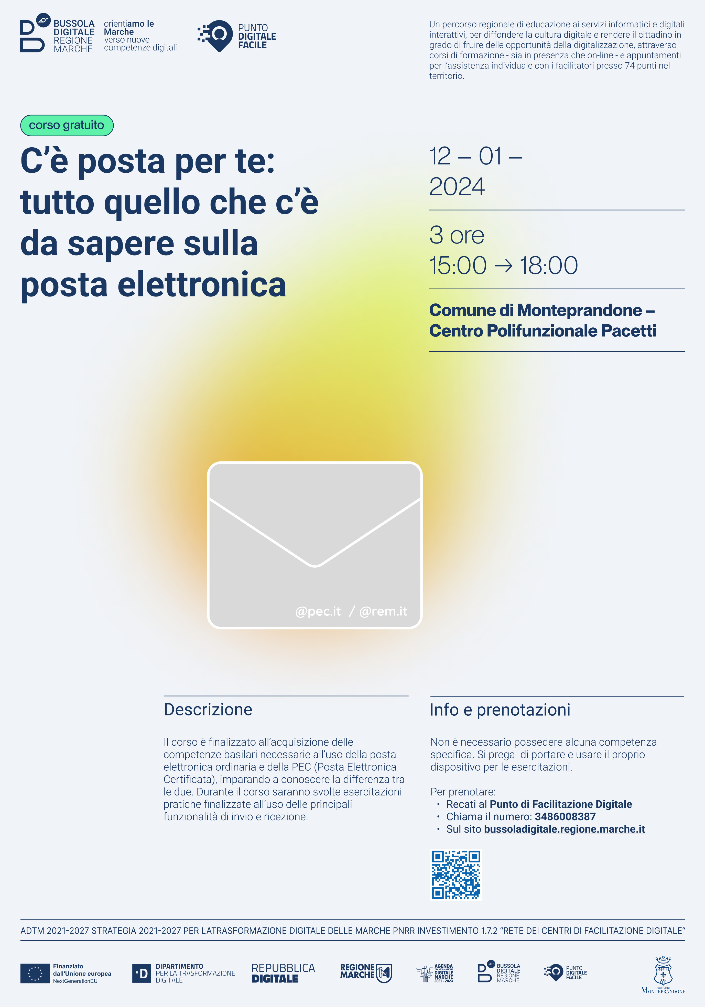 Nell’ambito del progetto “Bussola Digitale: OrientiAMO LE MARCHE”, attuato dalla Regione in virtù di un finanziamento del PNRR di 3,2 mln di euro, che ha permesso di attivare 74 sportelli in tutte le Marche, uno dei quali a Monteprandone, a cui i cittadini posso rivolgersi per chiedere aiuto nell’accesso ai servizi online, è in partenza un ciclo di corsi in programma dal 15 dicembre 2023 al 15 marzo 2024 per implementare le competenze digitali dei cittadini.