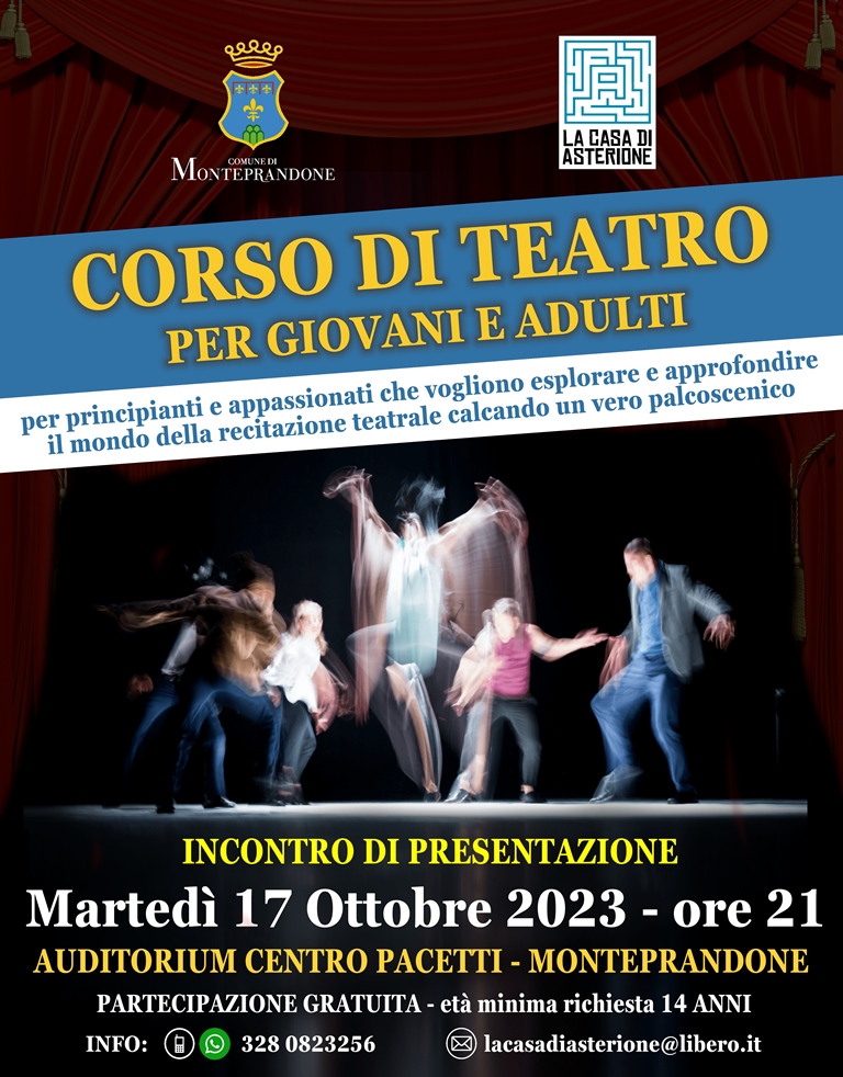 Il Comune di Monteprandone, in collaborazione con l’associazione di promozione sociale “La Casa di Asterione”, per il terzo anno consecutivo, organizza un corso di teatro gratuito riservato a giovani e adulti.