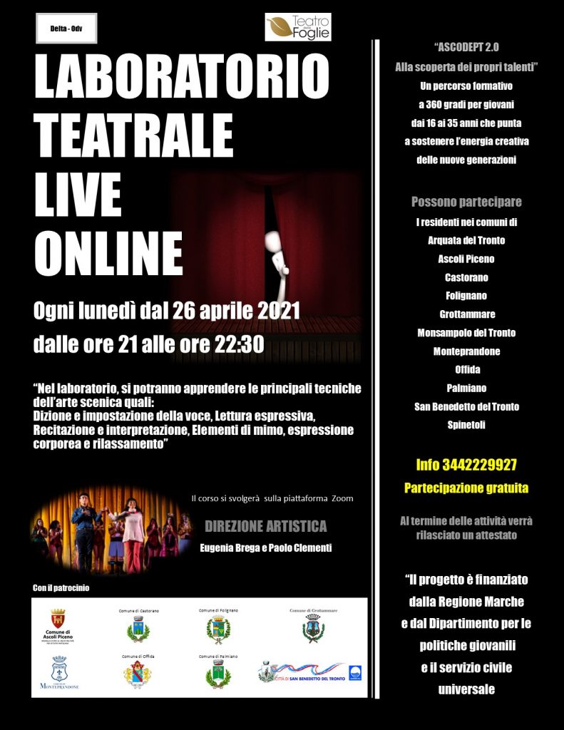 Prenderà il via lunedì 26 aprile un laboratorio teatrale gratuito che si svolgerà in modalità live ed on line.