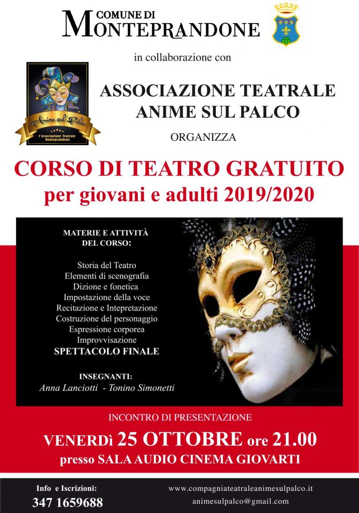 Il Comune di Monteprandone, in collaborazione con l’associazione teatrale “Anime sul palco”, organizza un corso di teatro gratuito riservato a giovani e adulti. Per questo venerdì 25 ottobre, alle ore 21, presso la sala audiocinema del Centro GiovArti, è in programma un incontro di presentazione dell’iniziativa.