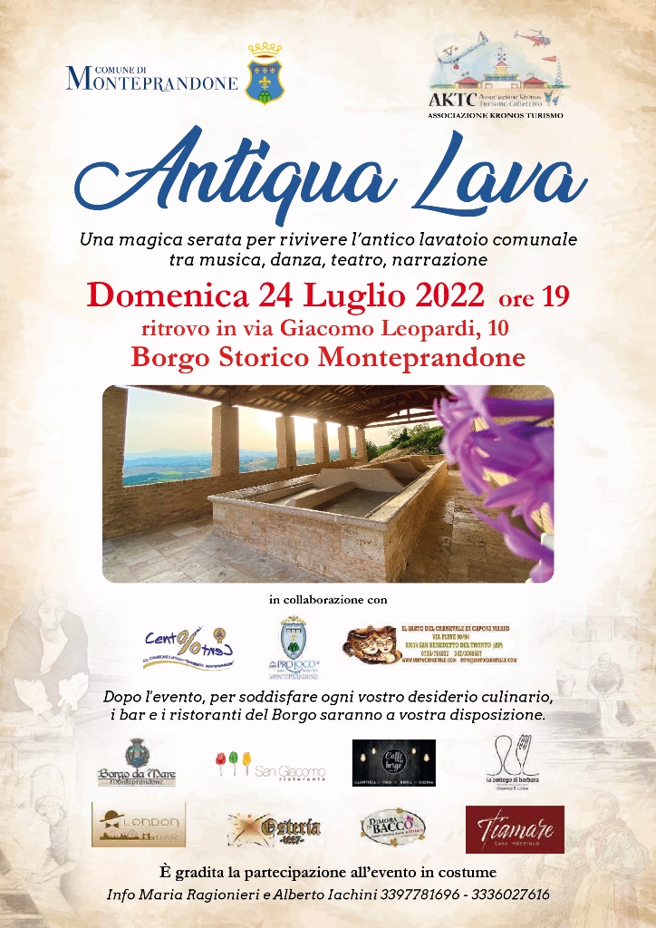 Si chiama Antiqua Lava e sono due serate magiche per riviere l'Antico Lavatoio Comunale tra musica, danza, teatro e narrazione in programma domenica 24 luglio (ore 19) e martedì 16 agosto 2022 (ore 21) con ritrovo in via San Giacomo, 10 nel Borgo Storico di Monteprandone.