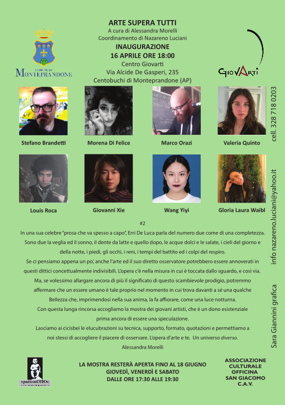 Domenica 16 aprile, alle ore 18, presso il Centro GiovArti a Centobuchi, prenderà il via il secondo appuntamento con l’arte contemporanea, dove otto giovani artisti si confronteranno con le loro opere inedite e speciali.