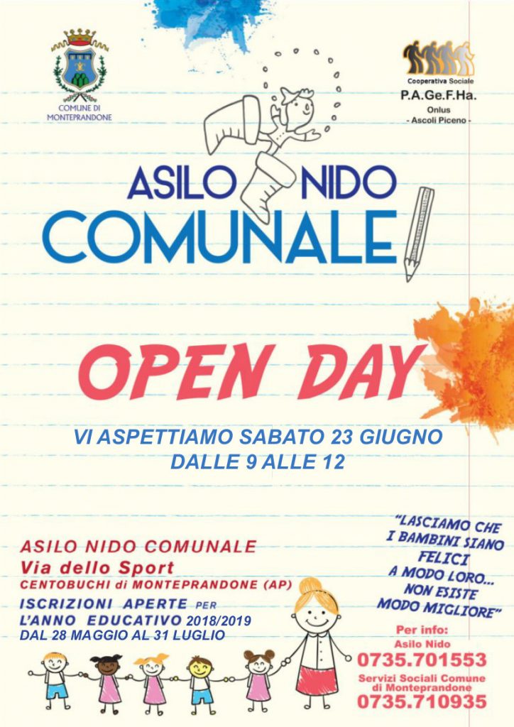 L’Amministrazione Comunale di Monteprandone, in collaborazione con la cooperativa sociale P.A.Ge.F.Ha. onlus, organizza per sabato 23 giugno l’apertura straordinaria dell’asilo nido comunale.