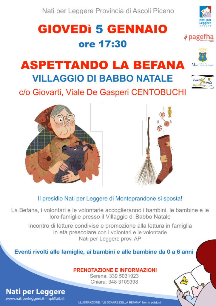 Per un giorno il presidio Nati per Leggere di Monteprandone, da poco aperto presso il Nido Comunale di Centobuchi, si sposterà nel Rifugio di Babbo Natale, allestito in occasione del Natale al Centopercento, per un pomeriggio di letture insieme alla Befana.