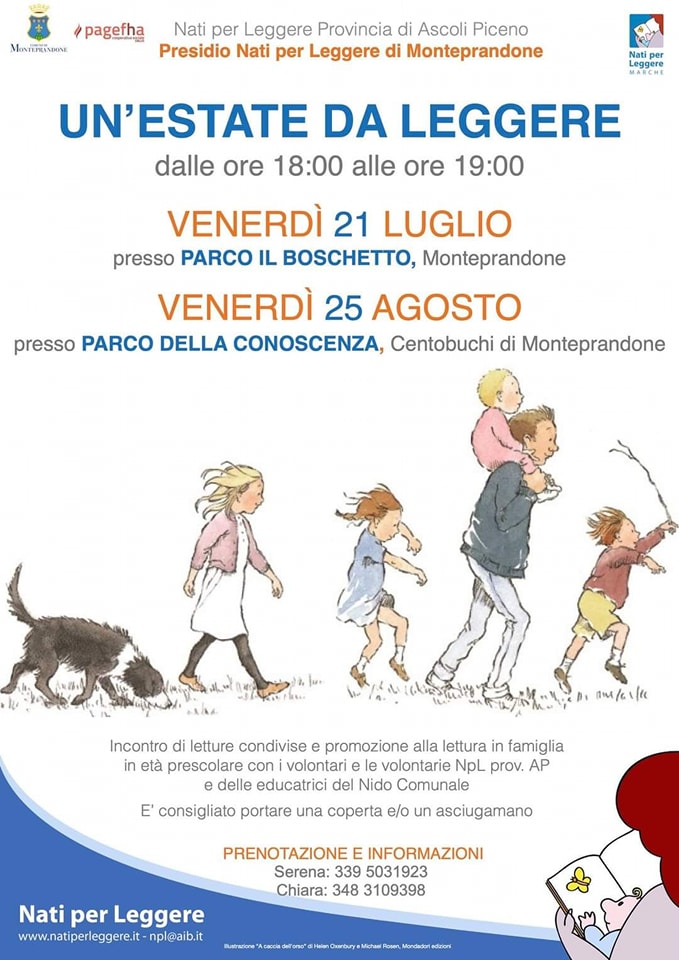 Proseguono anche nei mesi di luglio ed agosto gli incontri di letture condivise e promozione della lettura in famiglia per bambini e bambine in età prescolare curati dai volontari e dalle volontarie Nati per Leggere della Provincia di Ascoli Piceno, dalle educatrici del Nido Comunale in collaborazione con la cooperativa Pagefha, con il patrocinio del Comune di Monteprandone.