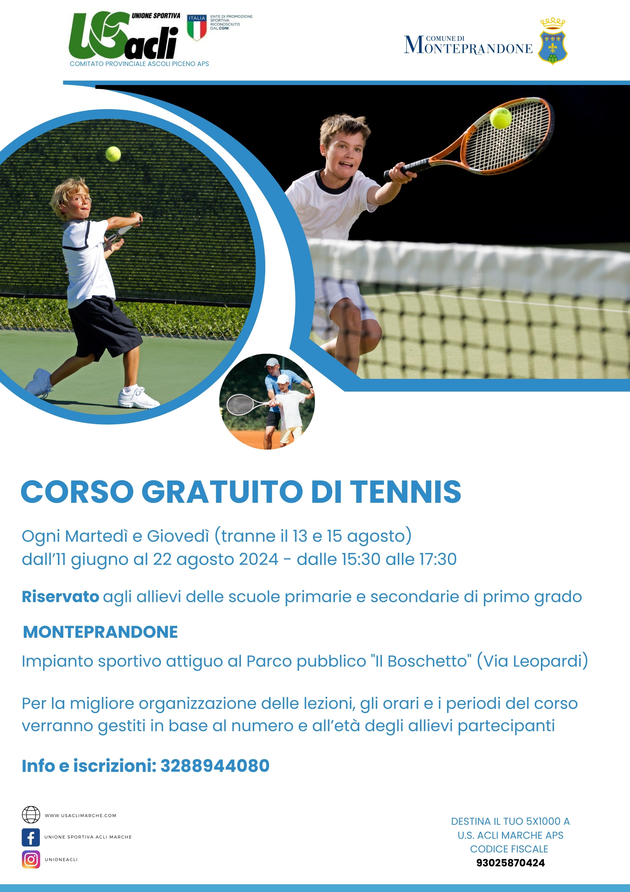 Per il secondo anno consecutivo U.S. Acli provinciale APS e Comune di Monteprandone propongono un corso gratuito estivo di tennis per bambini e ragazzi.