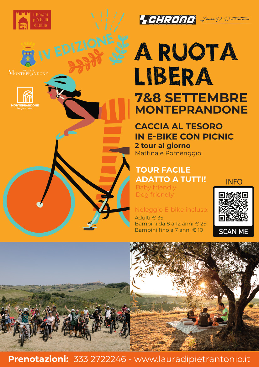Appuntamento sabato 7 e domenica 8 settembre in piazza dell’Aquila, nel borgo storico di Monteprandone, per la partenza di A Ruota Libera, non solo un tour in e-bike, ma una vera avventura perfetta per tutta la famiglia e per chiunque ami divertirsi in maniera autentica.