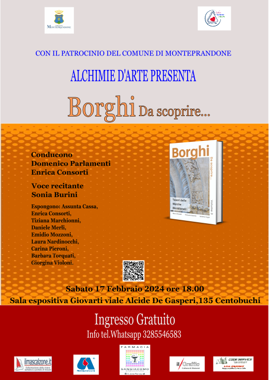 Secondo incontro culturale artistico di Alchimie d’Arte del 2024, Sabato 17 Febbraio ore 18, presso la: Sala espositiva Giovarti a Centobuchi (A.P.) durante la mostra degli artisti di Alchimie d’Arte nell’Ambito della manifestazione: “Il rifugio del cuore” organizzato dall’Associazione Cento per Cento di Centobuchi: , con il patrocinio del comune di Monteprandone, la collaborazione di Avis Monteprandone,Code Service e Farmacia S.Giacomo. L’Associazione presenta il volume “Borghi da scoprire 3 tesori delle MARCHE meridionali” di Mario Antonelli, Ferruccio Scoccia, Settimio Virgili.