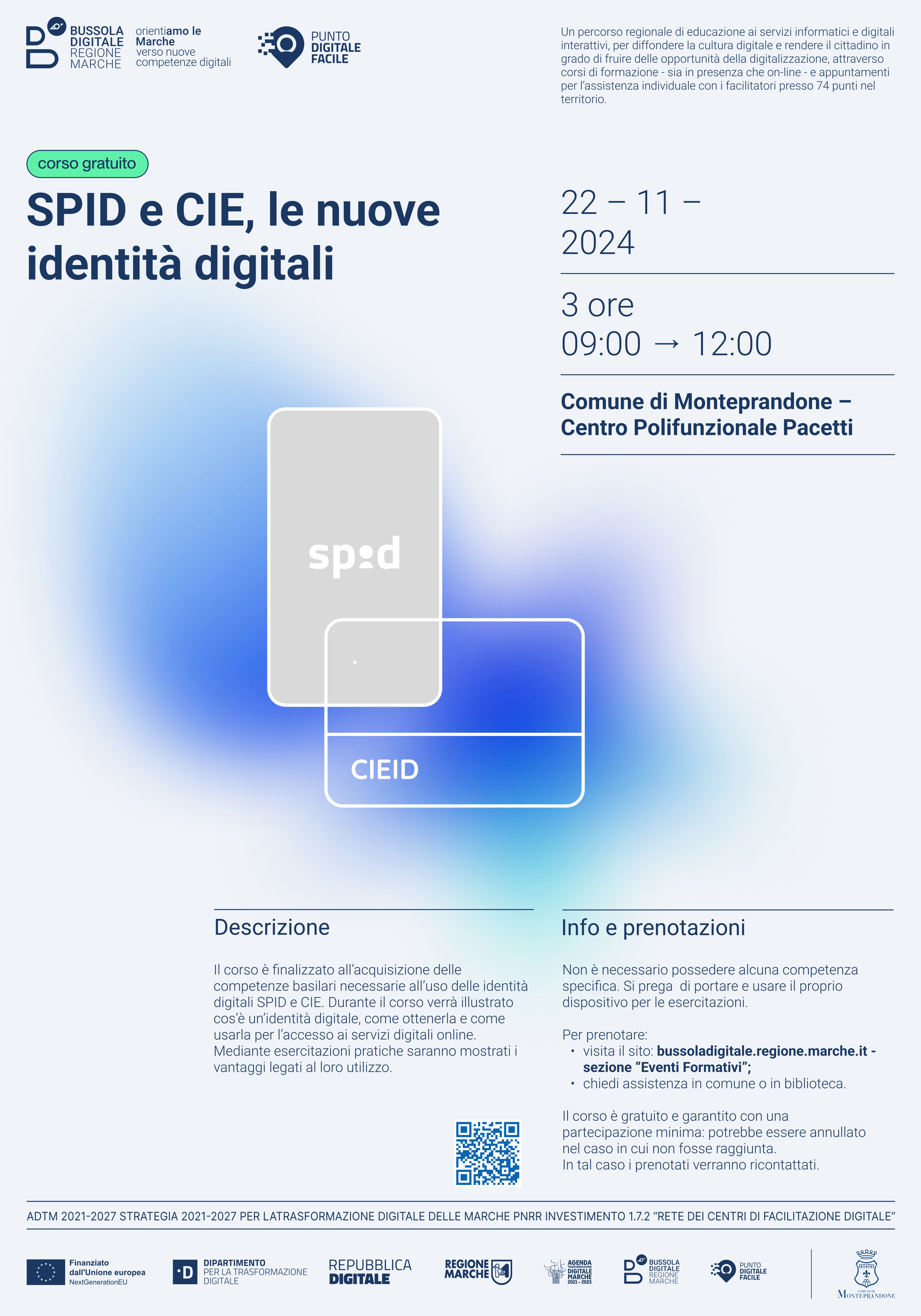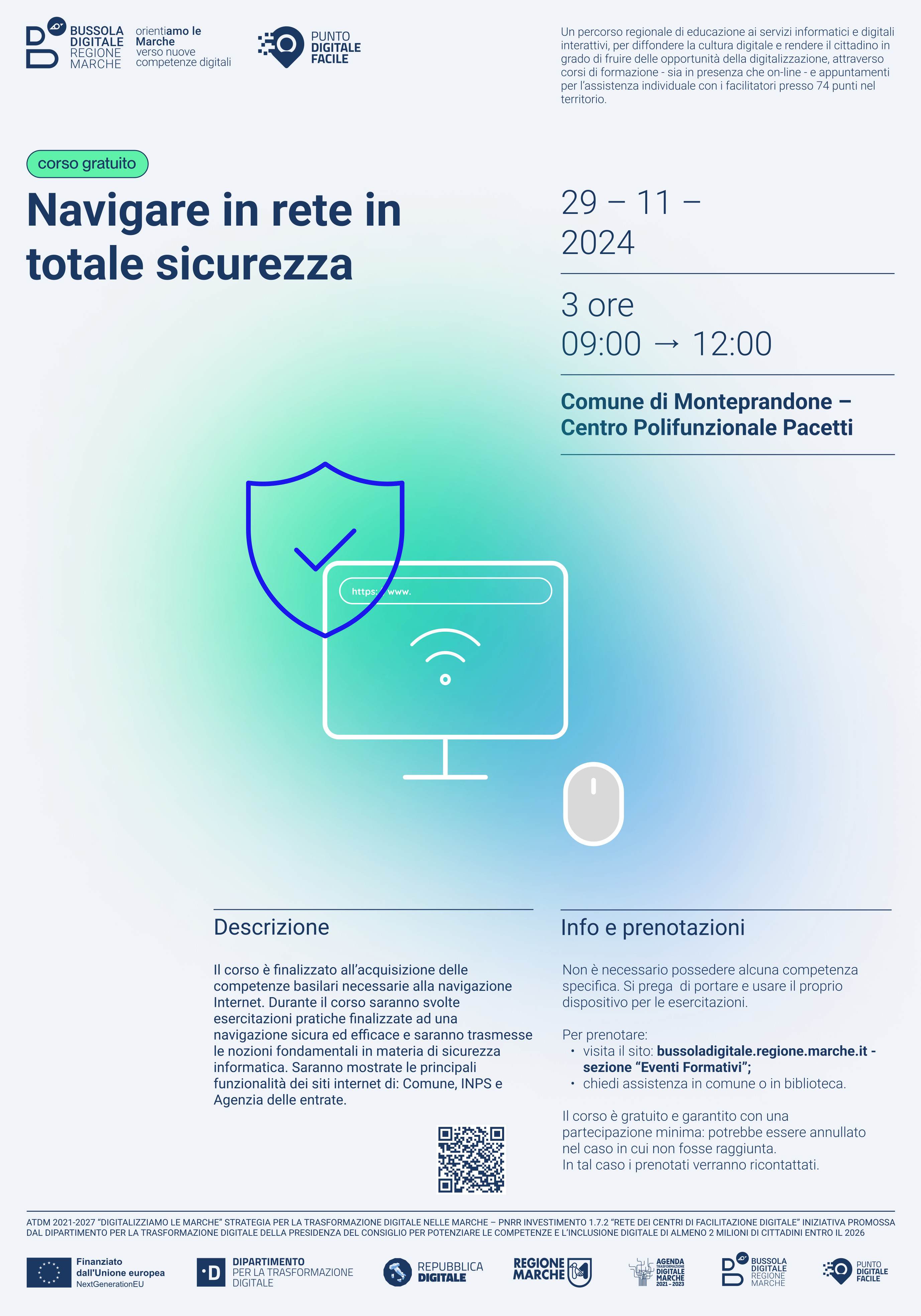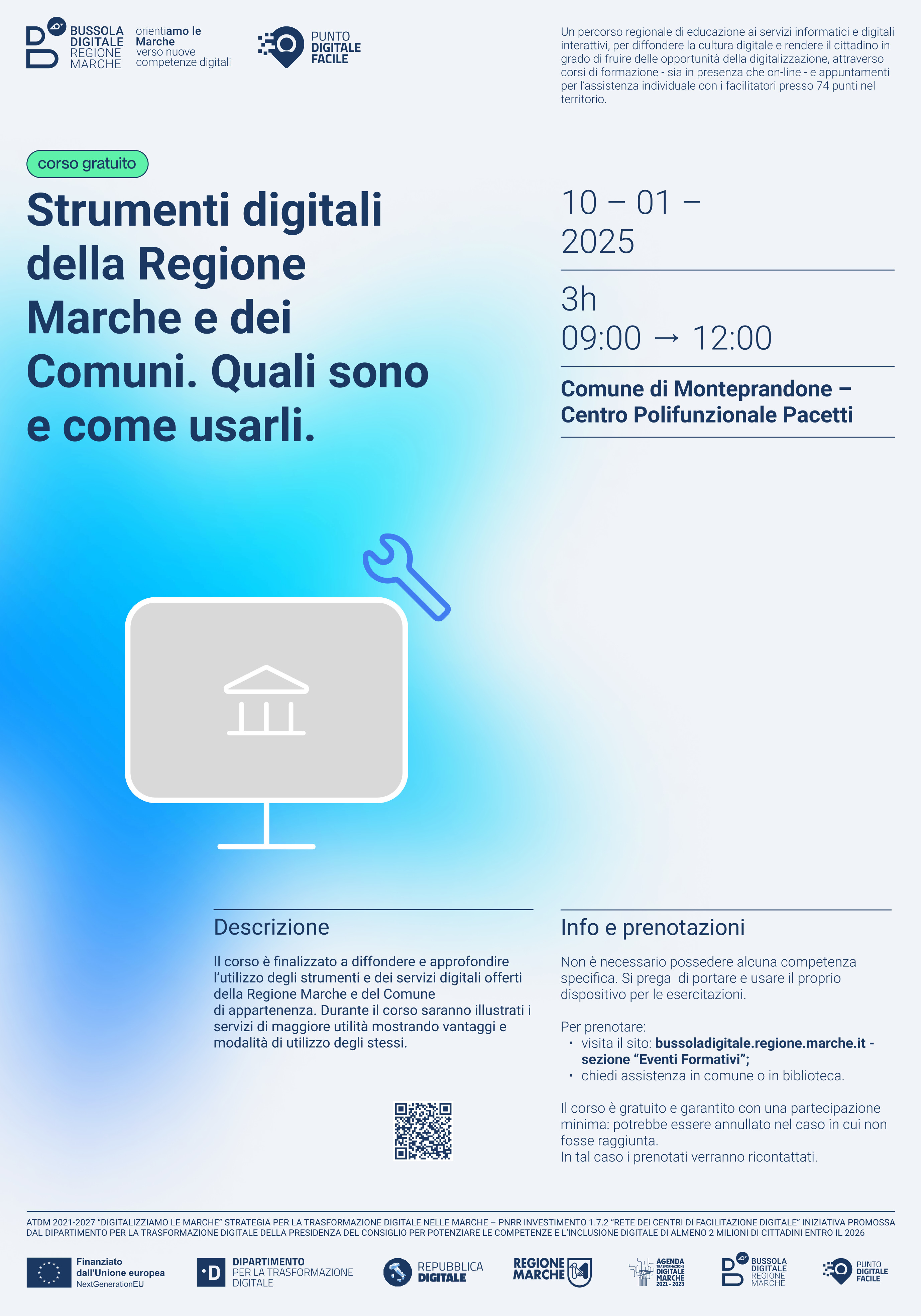 Riparte anche a Monteprandone il progetto “Bussola Digitale: OrientiAMO LE MARCHE”, attuato dalla Regione in virtù di un finanziamento del PNRR che ha permesso di attivare 74 sportelli in tutte le Marche, a cui i cittadini posso rivolgersi per chiedere aiuto nell’accesso ai servizi online e frequentare la seconda edizione dei corsi per implementare le competenze digitali dei cittadini.