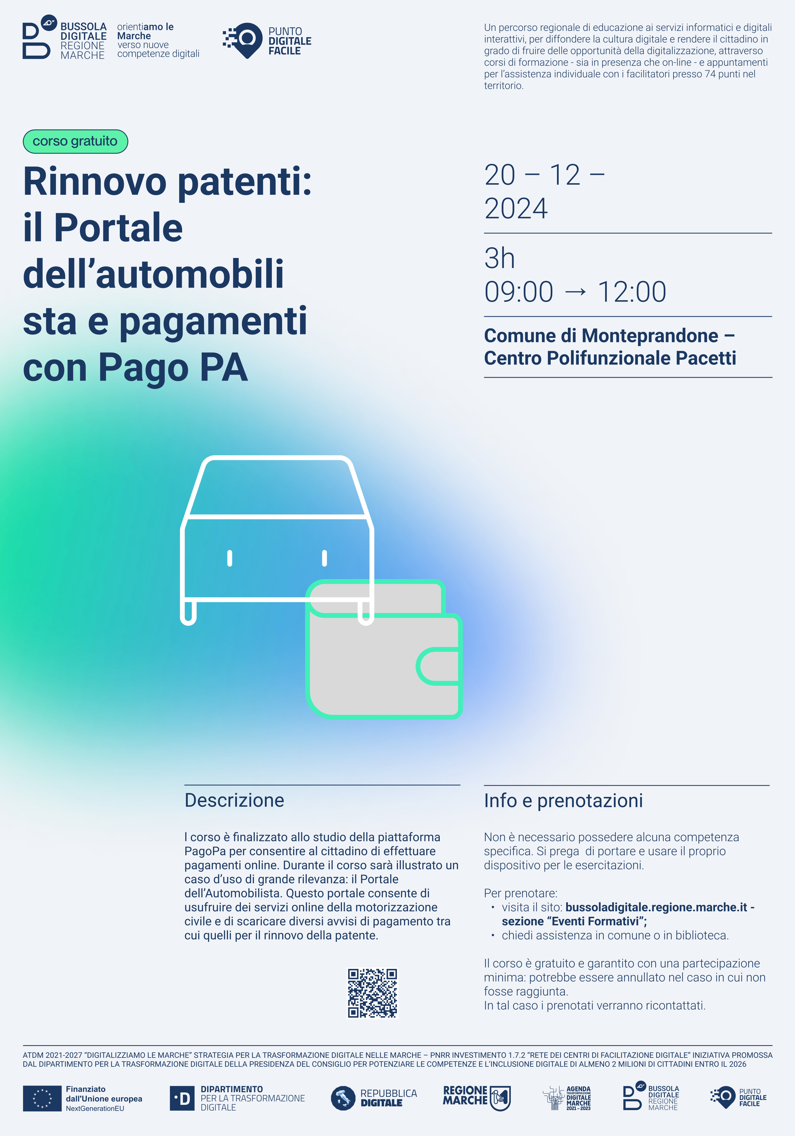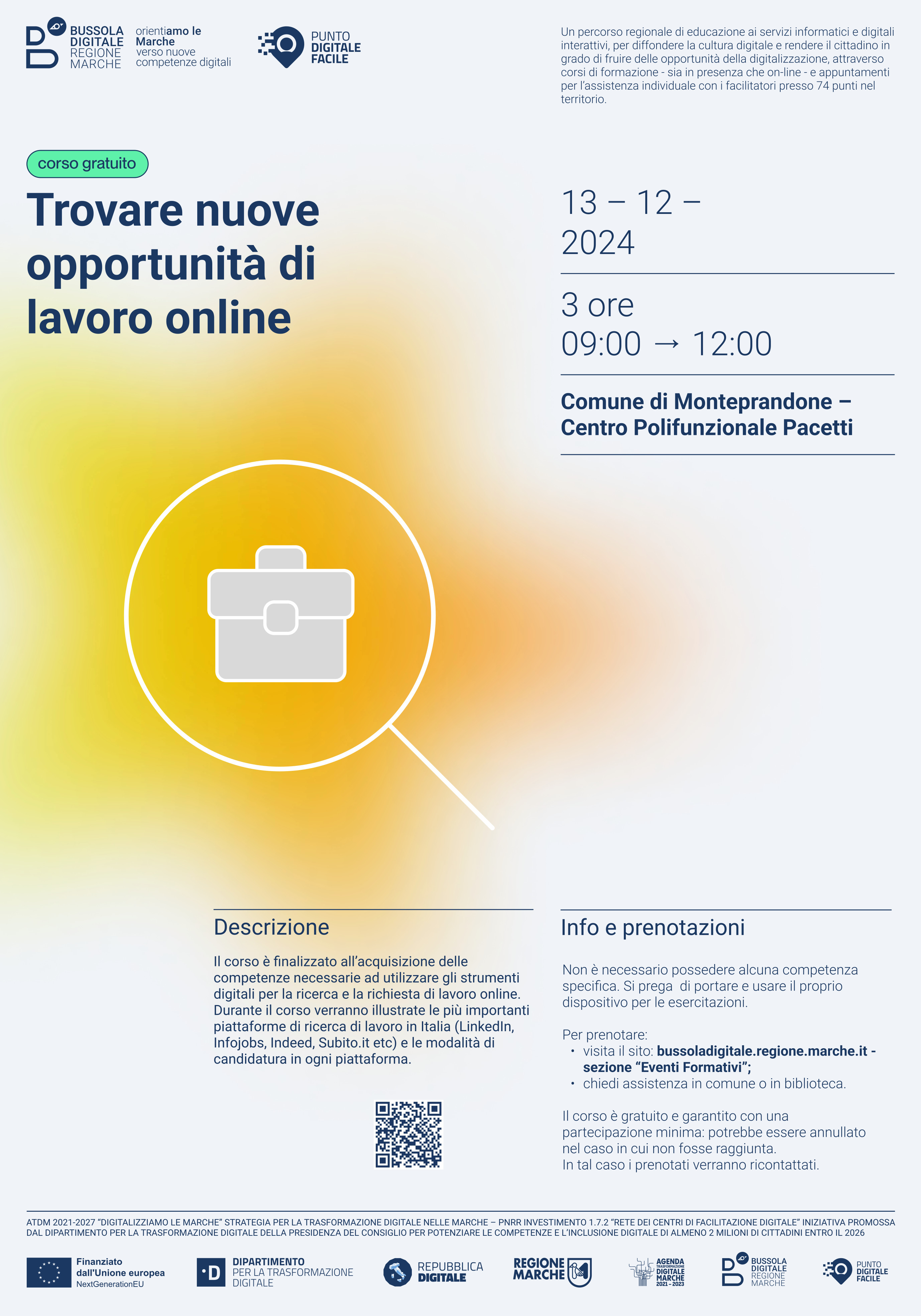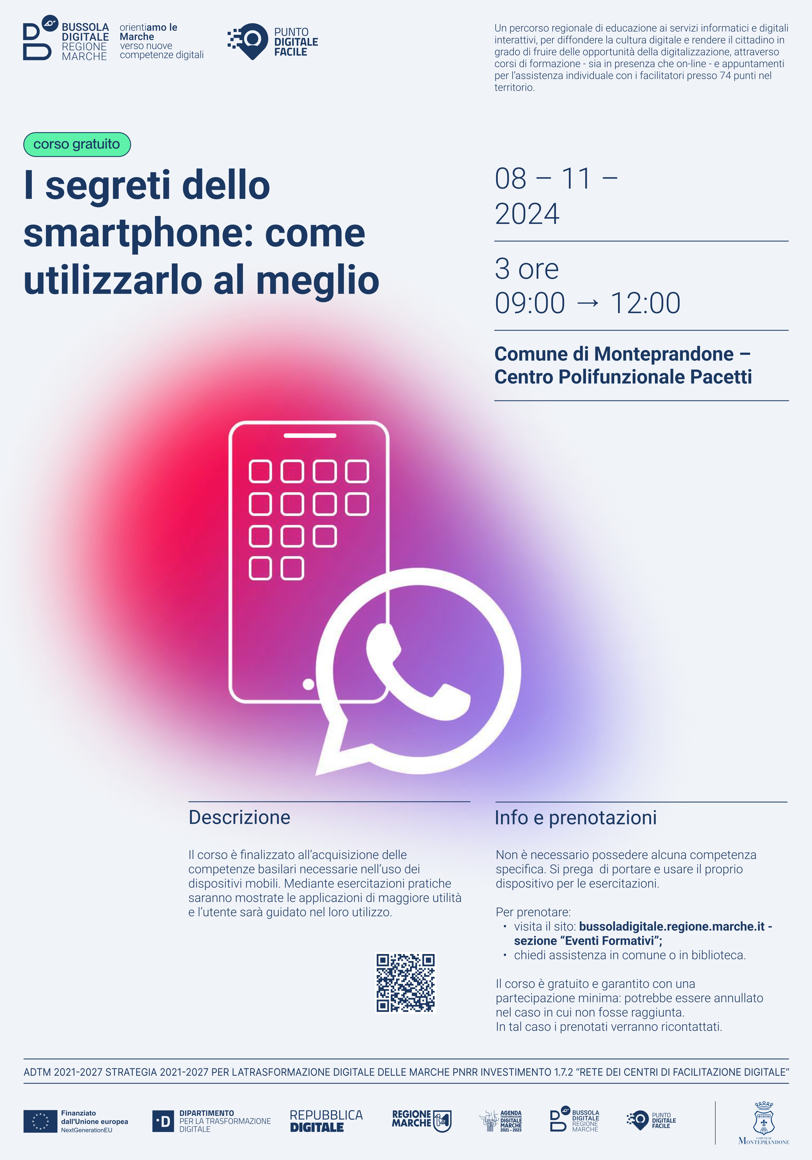 Riparte anche a Monteprandone il progetto “Bussola Digitale: OrientiAMO LE MARCHE”, attuato dalla Regione in virtù di un finanziamento del PNRR che ha permesso di attivare 74 sportelli in tutte le Marche, a cui i cittadini posso rivolgersi per chiedere aiuto nell’accesso ai servizi online e frequentare la seconda edizione dei corsi per implementare le competenze digitali dei cittadini.