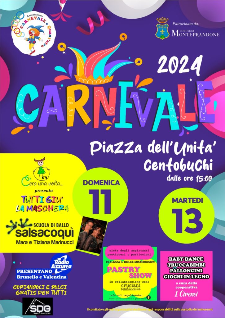 L’associazione Carnevale e quant’altro, con il patrocinio e il sostegno del Comune di Monteprandone, organizza il Carnevale 2024: due giorni di festa in piazza dell’Unità a Centobuchi. Due pomeriggi spumeggianti quelli di domenica 11 febbraio e martedì 13 febbraio, con animazione, baby dance, truccabimbi, balloon art, lego maxi, gonfiabili interattivi, laboratori creativi e maxi giochi in legno a cura della cooperativa sociale “I Cirenei”.