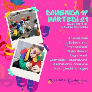 Due pomeriggi intensi quelli di domenica 19 febbraio e martedì 21 febbraio, con animazione, baby dance, truccabimbi, balloon art, lego maxi, gonfiabili interattivi, laboratori creativi e maxi giochi in legno a cura della cooperativa sociale “I Cirenei”.