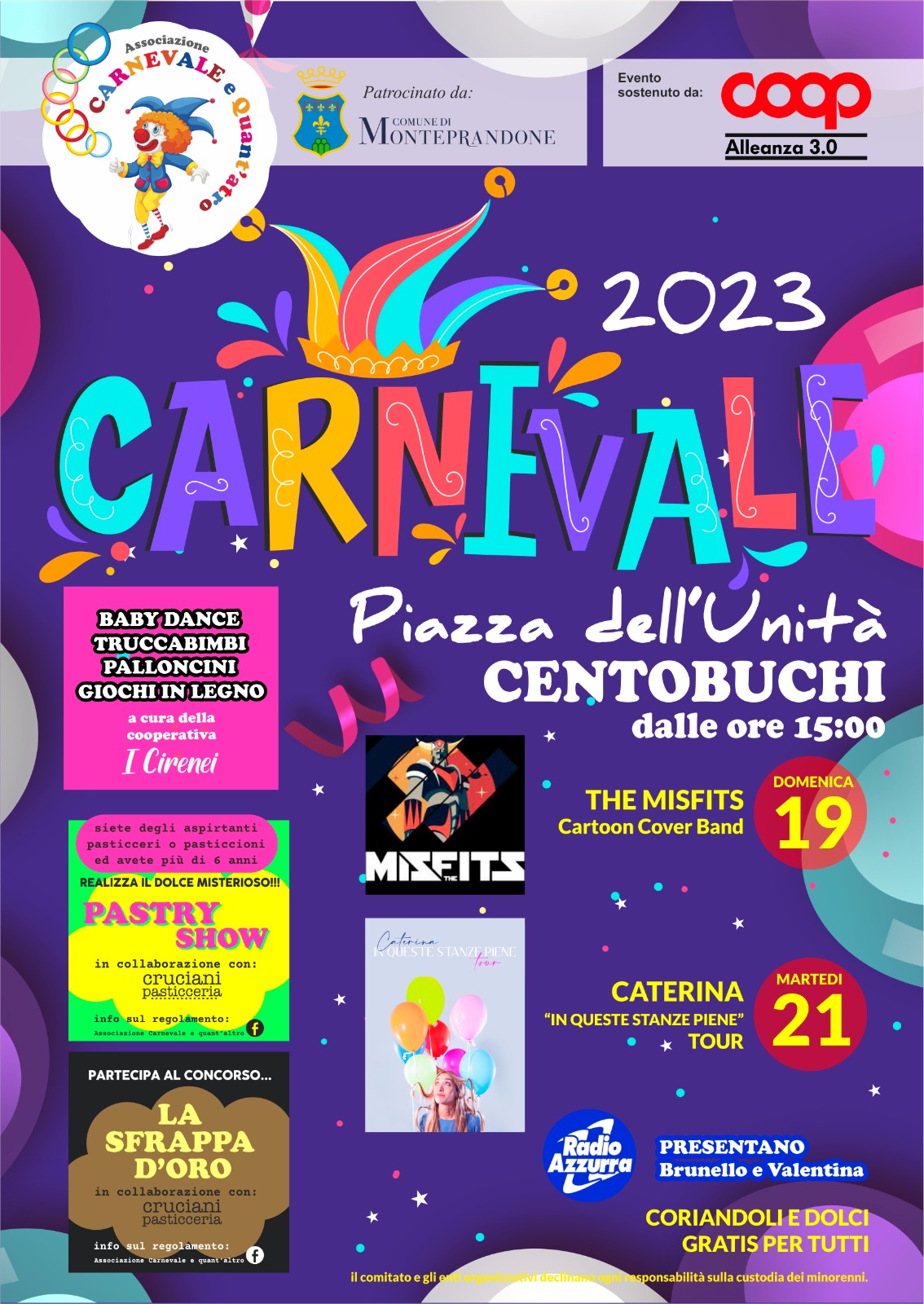 L’associazione Carnevale e quant’altro, con il patrocinio del Comune di Monteprandone e il sostegno della Coop Alleanza 3.0, organizza il Carnevale 2023 due giorni di festa in piazza dell’Unità a Centobuchi.