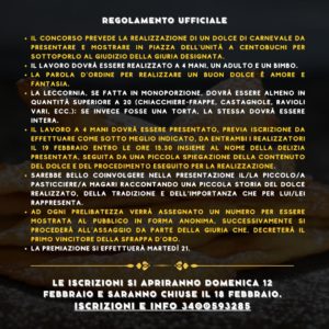 “Dopo lo stop dovuto alla pandemia, quest’anno abbiamo deciso di dedicare il Carnevale ai più piccoli – spiega Sabrina Bamonti, presidente dell’associazione Carnevale e quant’altro – scopo della manifestazione è portare tante persone in piazza offrendo momenti di allegria, aggregazione e sano divertimento non dimenticando di trasmettere alle nuove generazioni tutte le tradizioni di Carnevale, anche quelle culinarie. Per questo trasformeremo piazza dell’Unità in un villaggio ludico dove si potrà giocare, ballare, ridere e degustare i tradizionali dolci tipici di queste festività. A tutti i partecipanti verranno distribuiti gratuitamente coriandoli e non mancherà un assaggio di dolci”.
