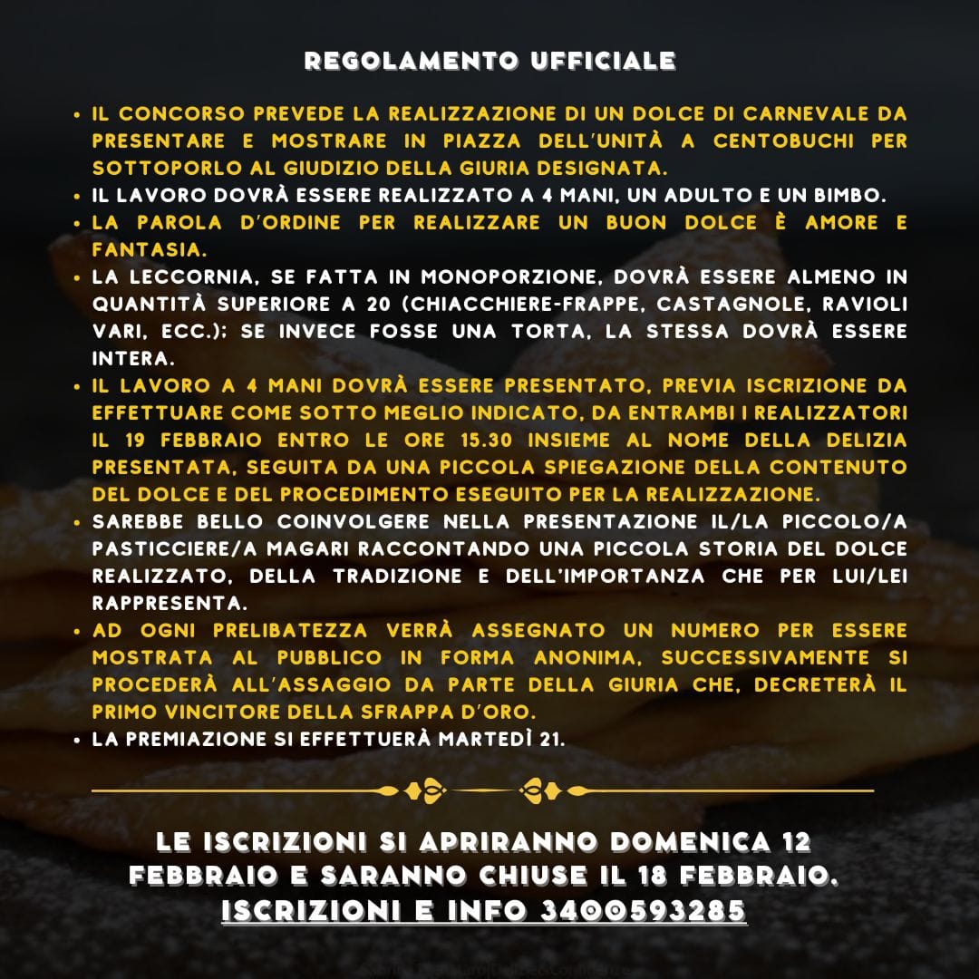 Domenica 19 ci saranno due momenti dedicati ai più golosi organizzati in collaborazione con la Pasticceria Cruciani di Centobuchi. Gli aspiranti pasticceri o “pasticcioni”, dai 6 anni su, possono iscrivetevi al Pastry Show per realizzare insieme in piazza il dolce misterioso, mentre i pasticceri provetti possono partecipare a “La Sfrappa d’Oro”, concorso che prevede la preparazione da parte degli iscritti, un adulto ed un bambino, di un dolce tipico di carnevale. I vincitori verranno premiati martedì 21 febbraio. Per informazioni e iscrizioni 3400593285.