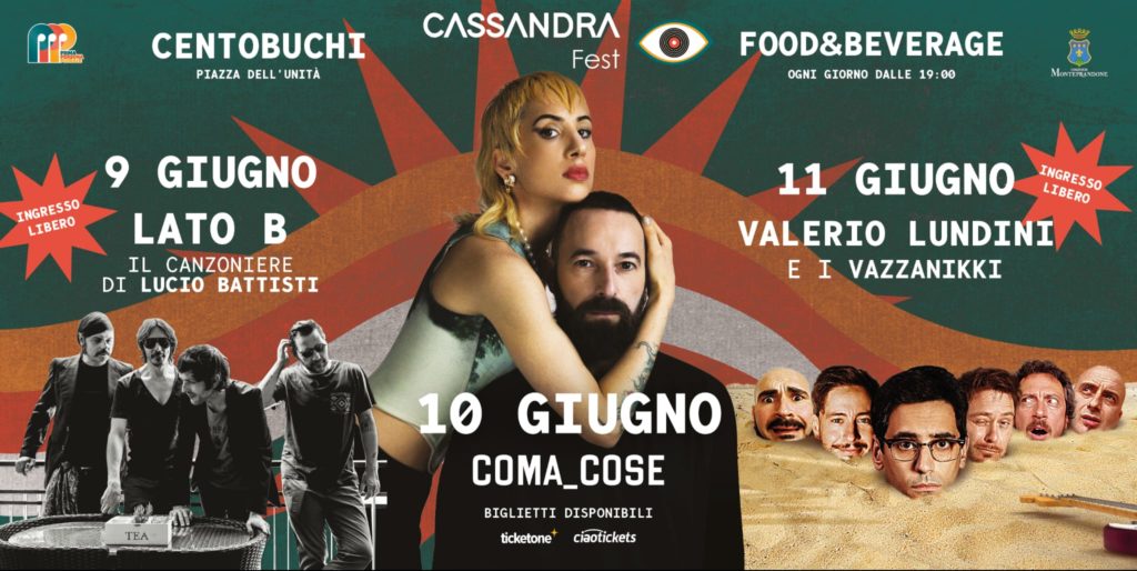 Tre serate di grande musica dal vivo in Piazza dell’Unità a Centobuchi. Venerdì 9 giugno si inizia con i LatoB, progetto musicale che omaggia Lucio Battisti riproponendo alcune delle sue più celebri canzoni. Sabato 10 giugno sarà la volta dei Coma Cose: duo milanese che ha saputo raggiungere le vette delle classifiche italiane grazie alla doppia partecipazione al Festival di Sanremo. A chiudere il Cassandra Fest sarà un ospite speciale, che unisce musica e comicità: domenica 11 giugno Valerio Lundini, insieme al suo gruppo I Vazzanikki, porteranno a Centobuchi il tour “Canzoni carine, altre meno”.