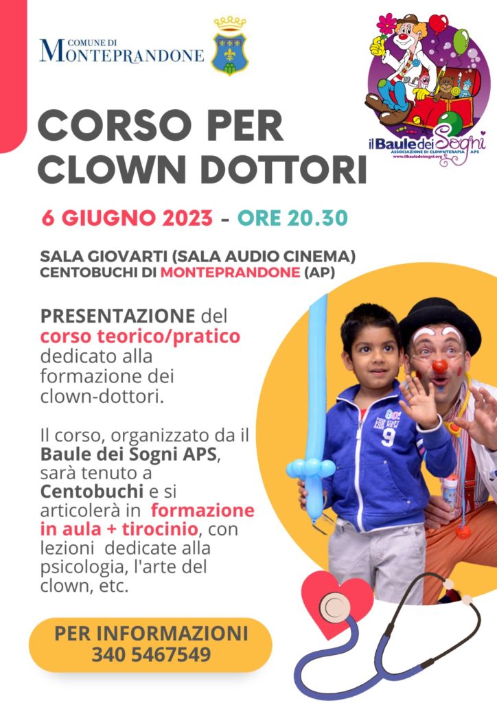L’associazione “Il Baule dei Sogni”, con il patrocinio del Comune di Monteprandone organizza un corso legato alla figura del clown dottore, per formare soggetti capaci di operare in reparti ospedalieri. La presentazione ci sarà martedì 6 giugno, alle 20:30, presso la sala audiocinema del Centro GiovArti, in viale De Gasperi 235 a Centobuchi.