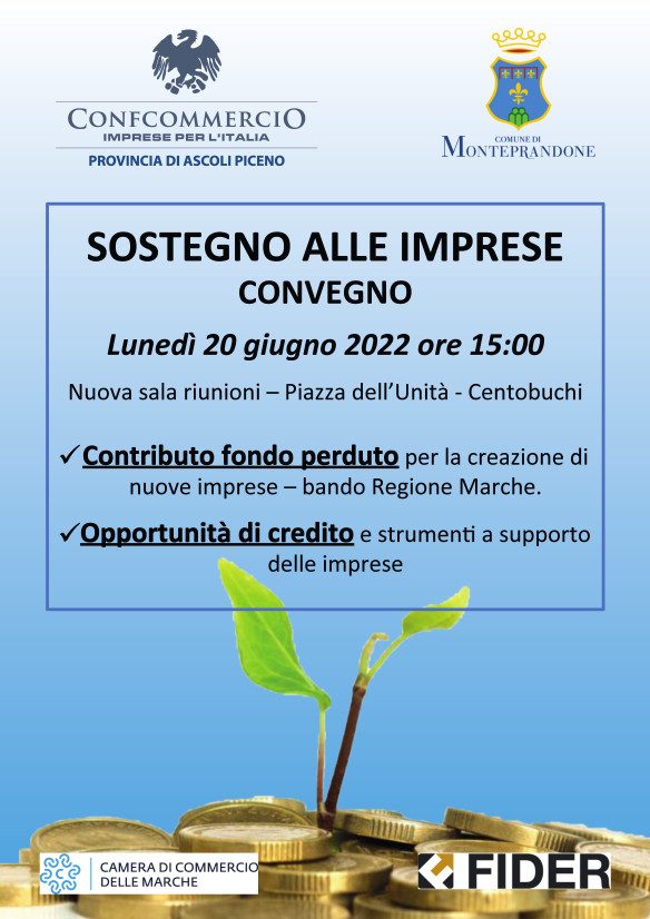 L’incontro, dal titolo “Sostegno alle Imprese”, prevede l’intervento dei funzionari Confcommercio che illustreranno il Bando della Regione Marche che con decreto del 7 giugno 2022 ha previsto la riapertura dei termini per la presentazione delle domande per il “sostegno alla creazione d’impresa”, Il Bando prevede un contributo a fondo perduto da 15 mila a 35 mila euro ed è dedicato alle persone disoccupate che hanno intenzione di realizzare il loro progetto imprenditoriale, le domande per accedere al contributo scadranno il 30 giugno 2022.