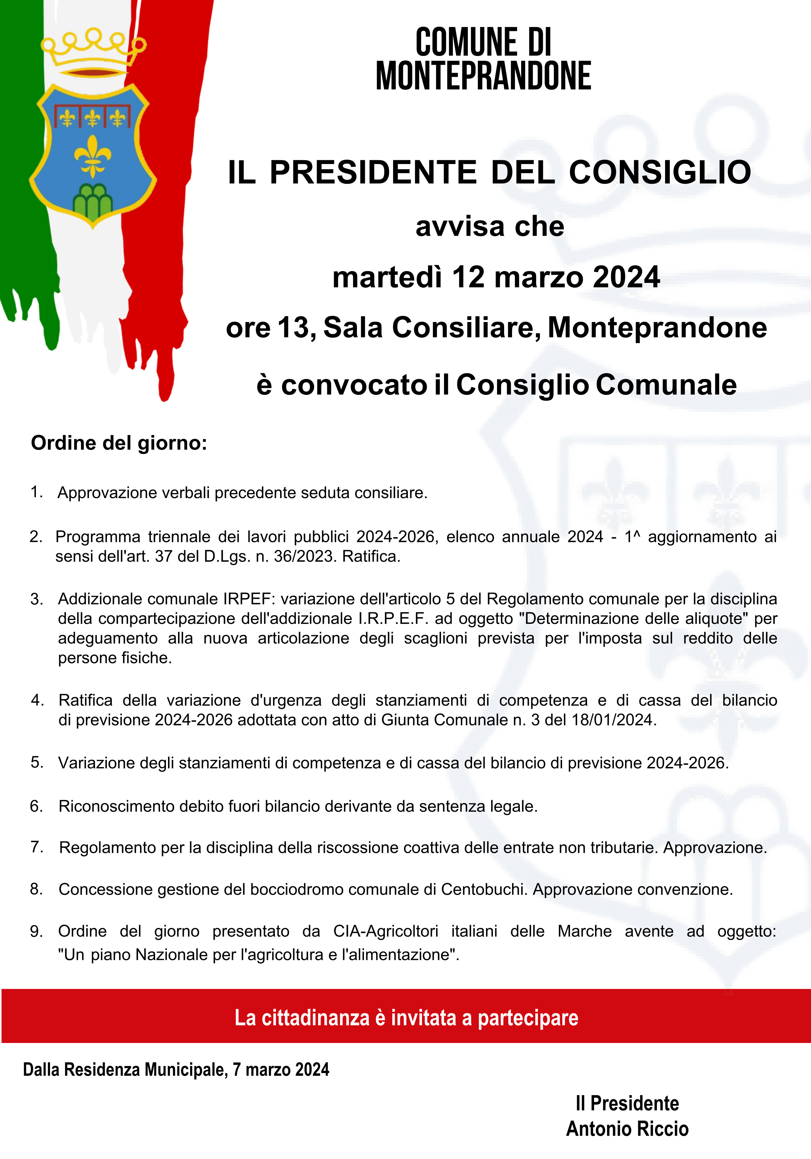 Il presidente del Consiglio comunale Antonio Riccio ha convocato per martedì 12 marzo 2024 alle ore 13, in sessione ordinaria di prima convocazione e in seduta pubblica, presso la sala consiliare di Monteprandone per discutere il seguente: