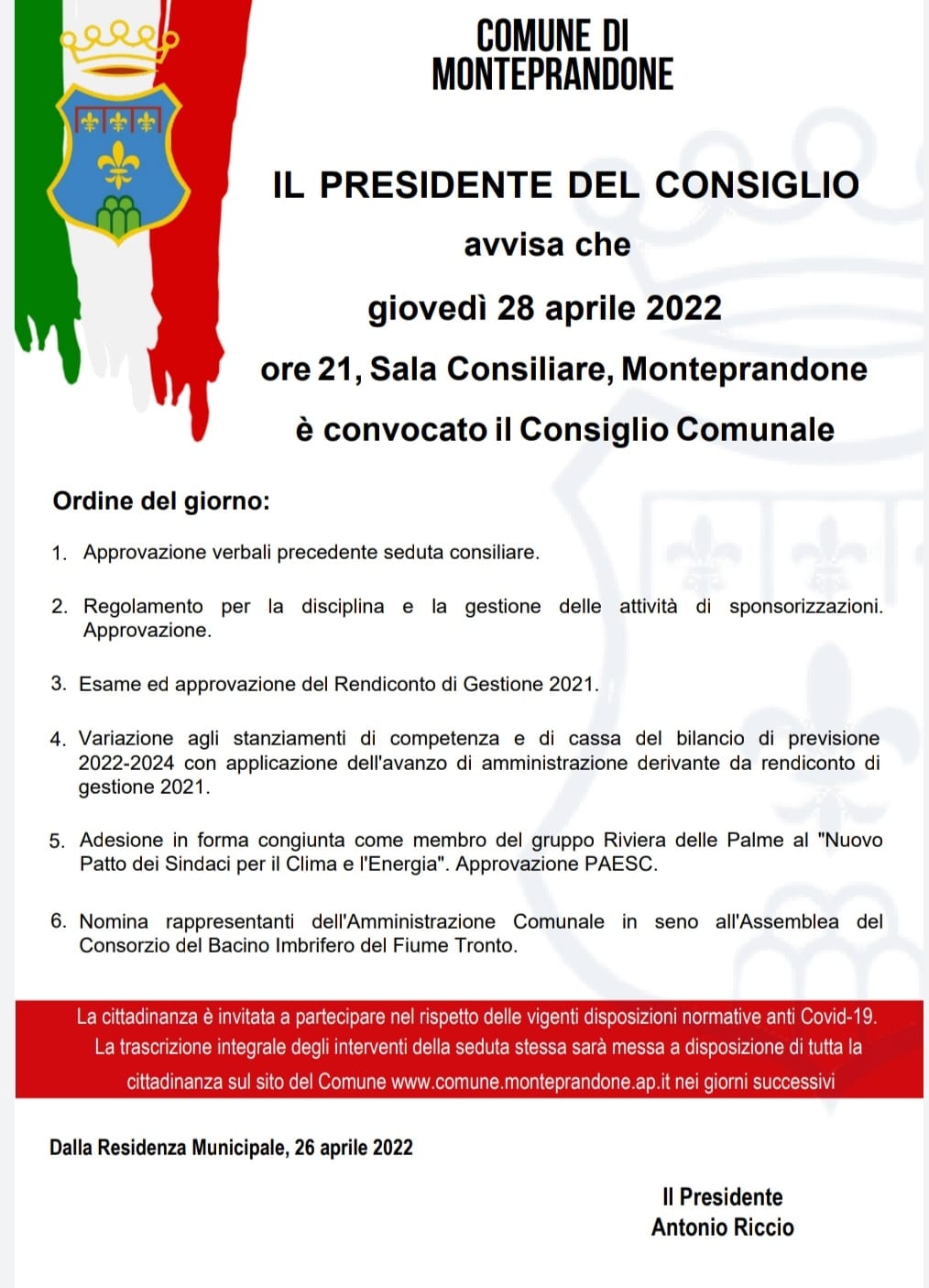 Il presidente del Consiglio comunale Antonio Riccio ha convocato per giovedì 28 aprile 2022, alle ore 21, in sessione ordinaria di prima convocazione e in seduta pubblica, presso la sala consiliare di Monteprandone per discutere il seguente: