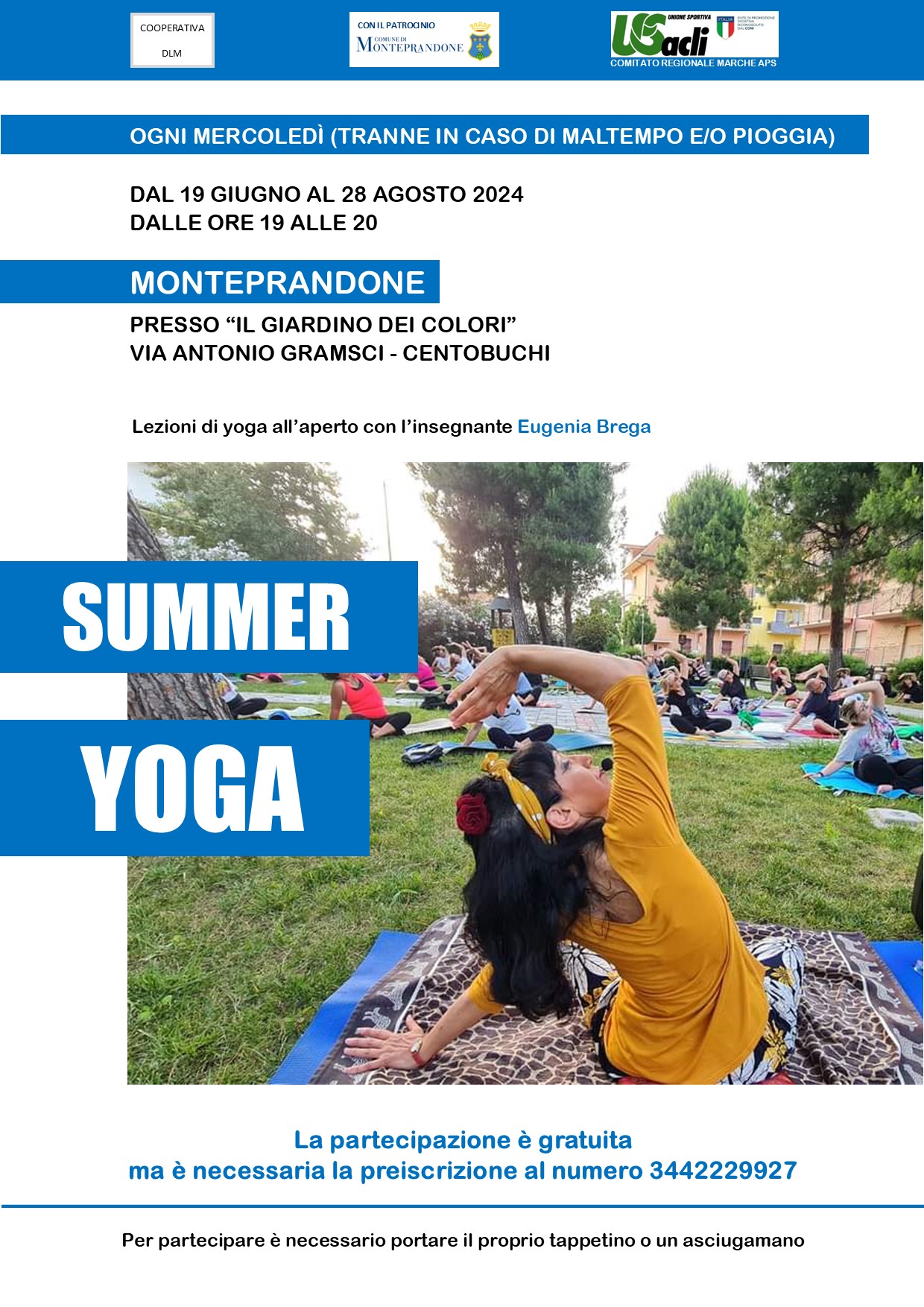 Si tratta di lezioni gratuite di yoga, tenute dall’insegnante Eugenia Brega, che si svolgeranno ogni mercoledì fino al 28 agosto (tranne in caso di pioggia) presso il Parco “Il Giardino dei colori” in via Gramsci a Centobuchi.