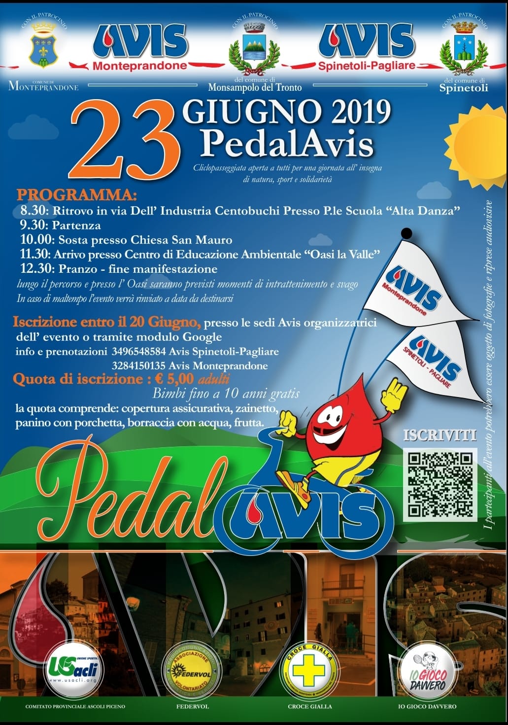 È possibile iscriversi entro il 20 giugno tramite il modulo Google appositamente creato o nelle sedi Avis di Monteprandone e Spinetoli dove sarà possibile pagare la quota di partecipazione di € 5 (bimbi fino a 10 anni gratis).