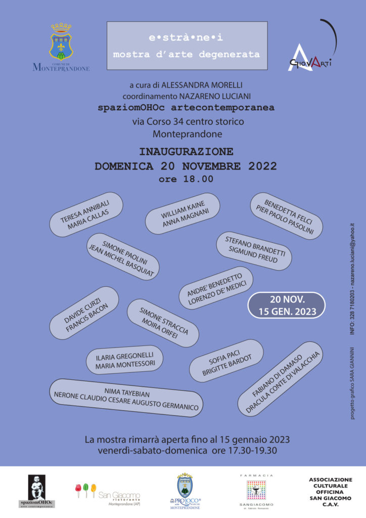 Si intitola “e·strà·ne·i – mostra d’arte degenerata” il nuovo evento espositivo che sarà inaugurato domenica 20 novembre, alle ore 18, presso lo spaziomOHOc di Monteprandone.