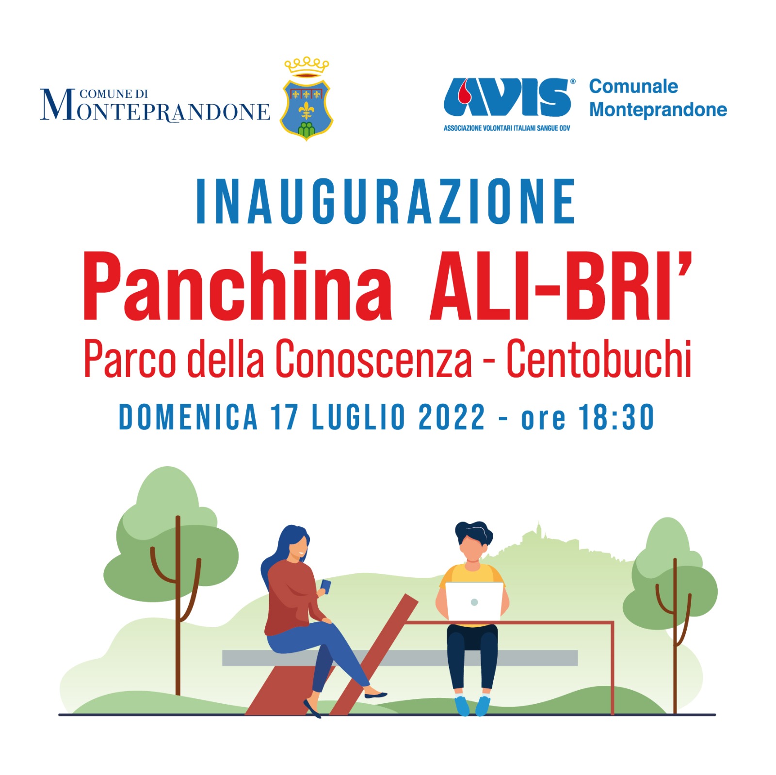 Domenica 17 Luglio alle ore 18:30 si terrà l’inaugurazione della panchina Ali-brì, all’interno del Parco della Conoscenza di Centobuchi. Fortemente voluta dai volontari Avis di Monteprandone, realizzata con il sostegno dell’Amministrazione Comunale, Ali-brì è una panchina dalle forme inconsuete che racchiude in sé tante funzioni e tanti significati.