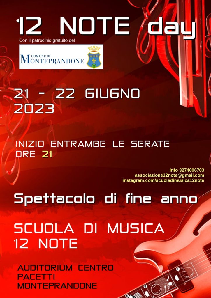 Il 21 e il 22 Giugno avrà luogo il consueto saggio di fine anno della Scuola di Musica 12 Note all'auditorium Pacetti di Monteprandone.