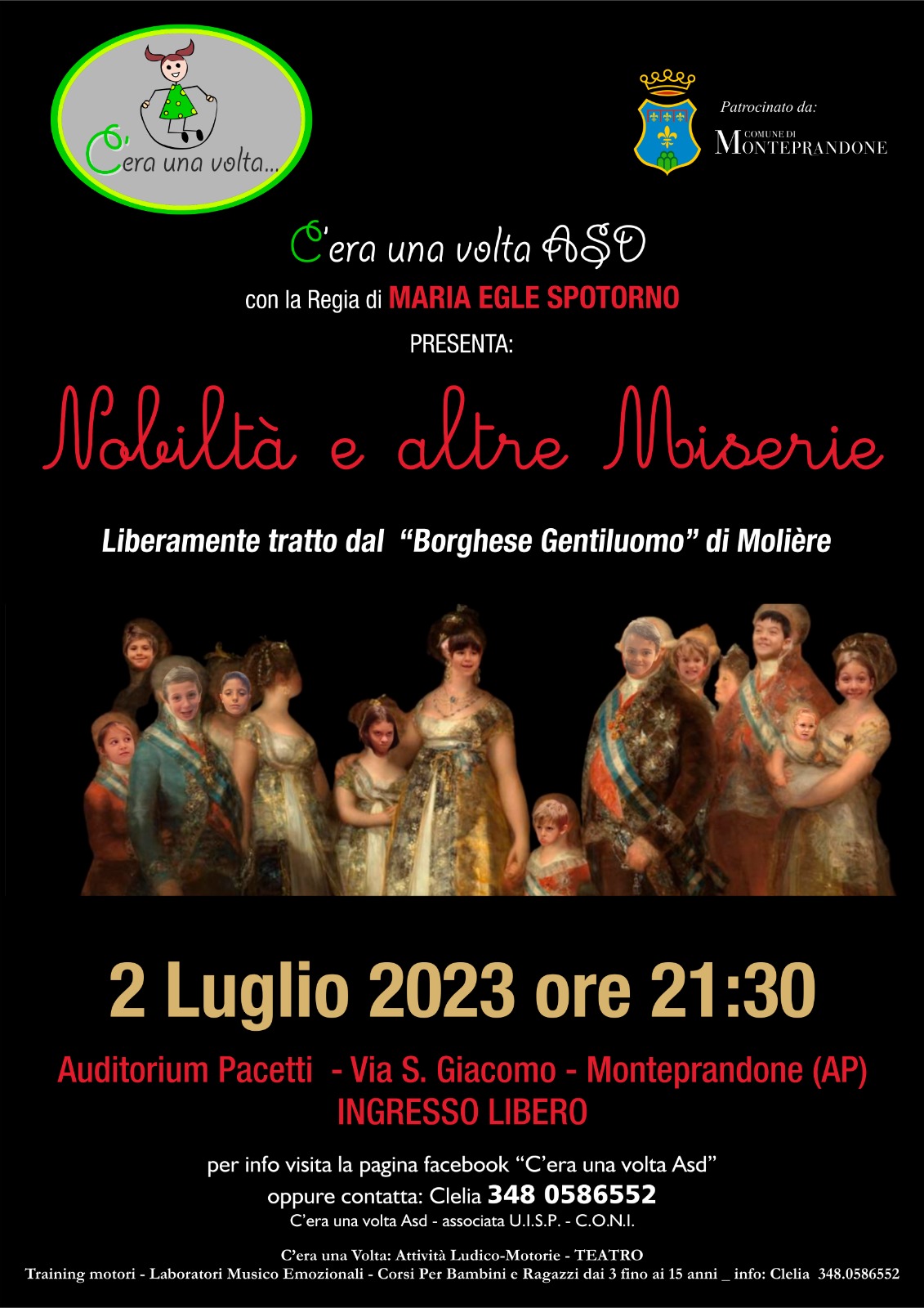 Liberamente tratto dal “Borghese Gentiluomo” di Molière, lo spettacolo, patrocinato dal Comune di Monteprandone, si terrà domenica 2 luglio, alle ore 21:30, presso l’Auditorium del Centro Pacetti in via San Giacomo n. 107 a Monteprandone con ingresso gratuito.