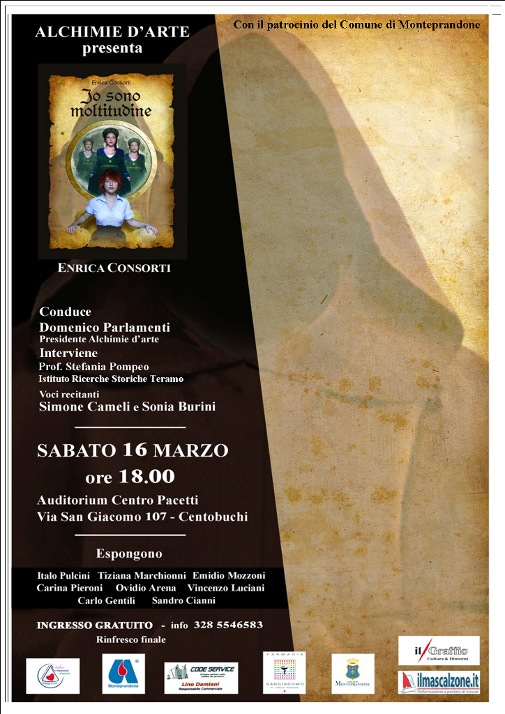 Quarto evento di Alchimie d’Arte del 2024. Sabato 16 marzo 2024 ore 18, all’Auditorium del centro Pacetti in via San Giacomo, 107 a Centobuchi, con il patrocinio del comune di Monteprandone, la collaborazione di Avis Monteprandone, Code Service e Farmacia San Giacomo, l’Associazione presenta la scrittrice Enrica Consorti, responsabile Artistica di Alchimie d’Arte e il suo primo romanzo, un thriller storico “Io sono moltitudine” ediz. You can Print.
