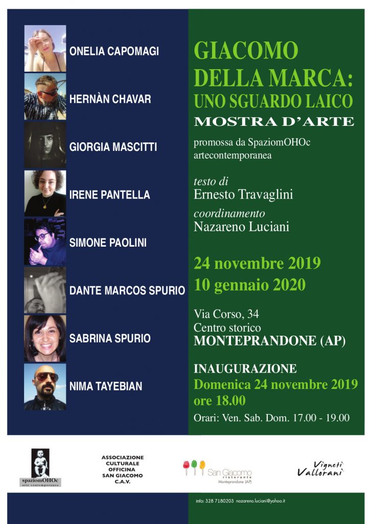 La serata si concluderà alle ore 18 con l’inaugurazione della mostra “Giacomo della Marca. Sguardo Laico” curata da Nazareno Luciani con testi di Ernesto Travaglini, presso lo SpaziomOHOc in via Corso. Esporranno gli artisti Onelia Capomagi, Hernàn Chavar, Giorgia D. Mascitti, Irene Pantella, Simone Paolini, Dante Marcos Spurio, Sabrina Spurio e Nima Tayebian.