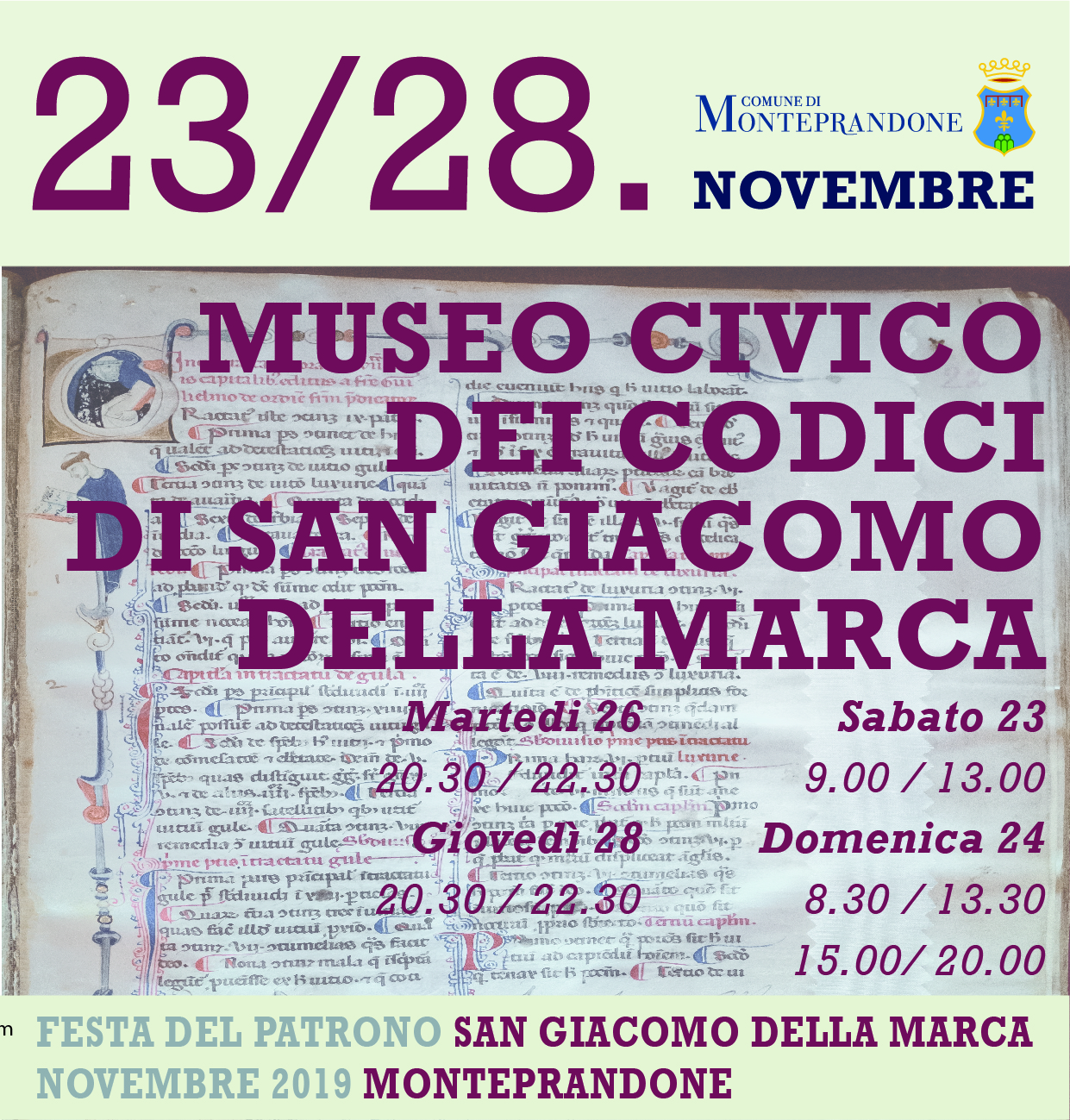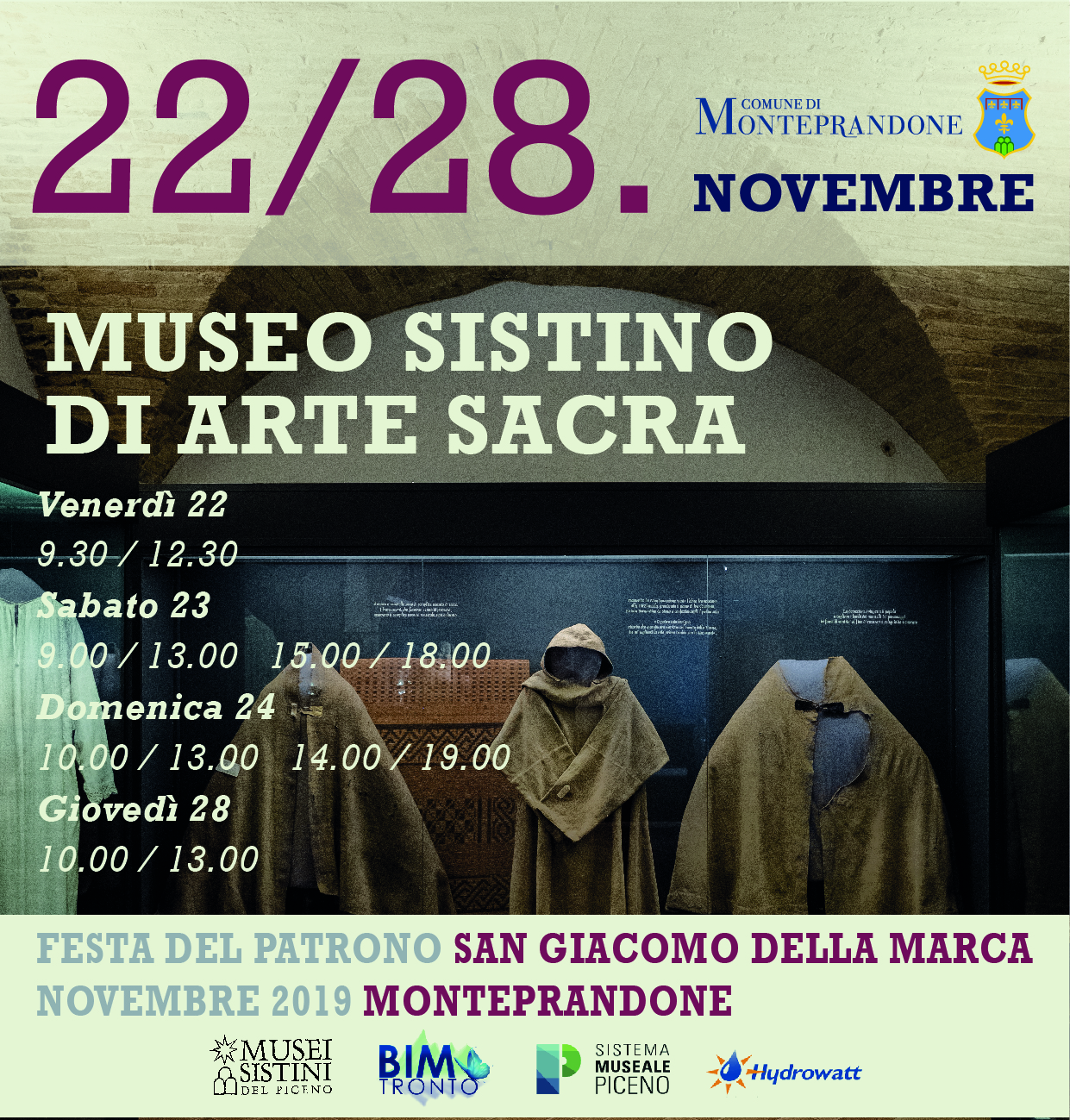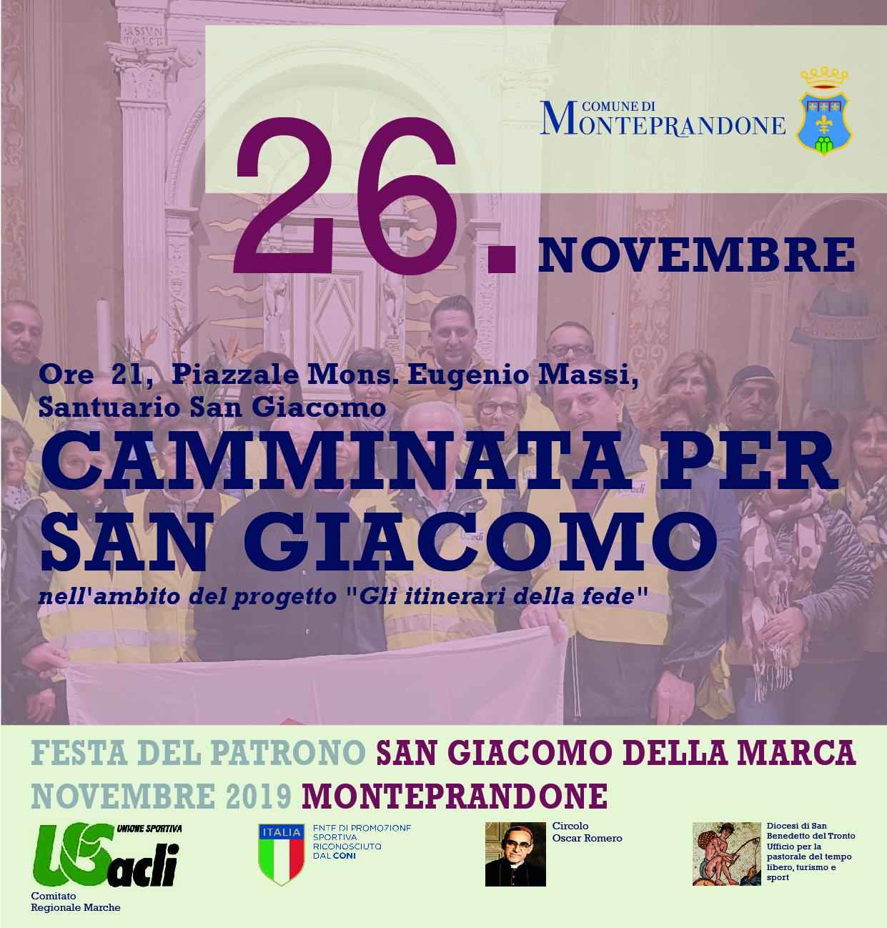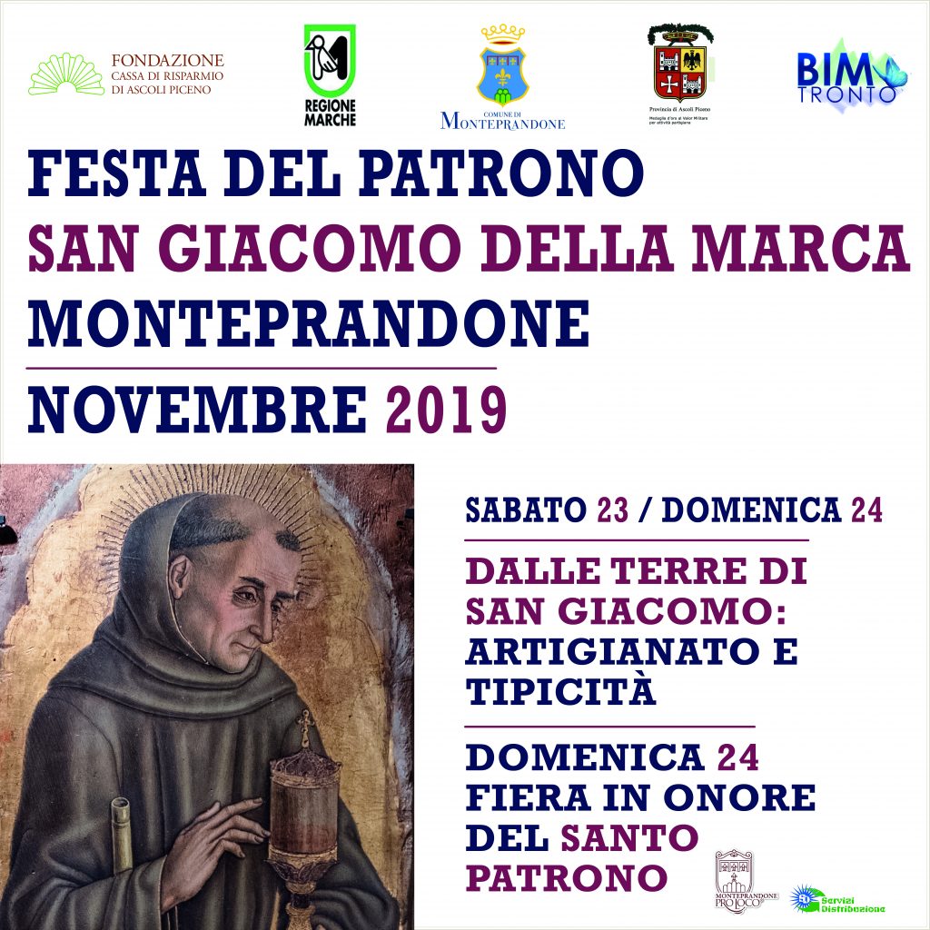 Ricordiamo che il programma dei festeggiamenti è organizzato dal Comune di Monteprandone in collaborazione con Proloco Monteprandone, associazione San Giacomo della Marca e Santa Maria delle Grazie, Parrocchia San Nicolò, Musei Sistini del Piceno, associazione Castrum Prandonis, associazione 17 Festival, Corale San Nicolò, associazione Piceno Mood, Unione sportiva Acli, Avis Monteprandone, spaziomOHOc di Nazareno Luciani, associazione commercianti e artigiani Centopercento, Circolo Culturale “Guardiamo al Futuro” onlus e gode del patrocinio della Regione Marche, della Provincia di Ascoli Piceno, del Centro Studi San Giacomo della Marca, della Banca del Piceno; del sostegno della Fondazione Cassa di Risparmio di Ascoli Piceno, del Bacino Imbrifero del Tronto, della società Servizi Distribuzione, delle aziende Picena Zinc, Elettro Stella, GLS, Genny, Inim e Mia Arredamenti.