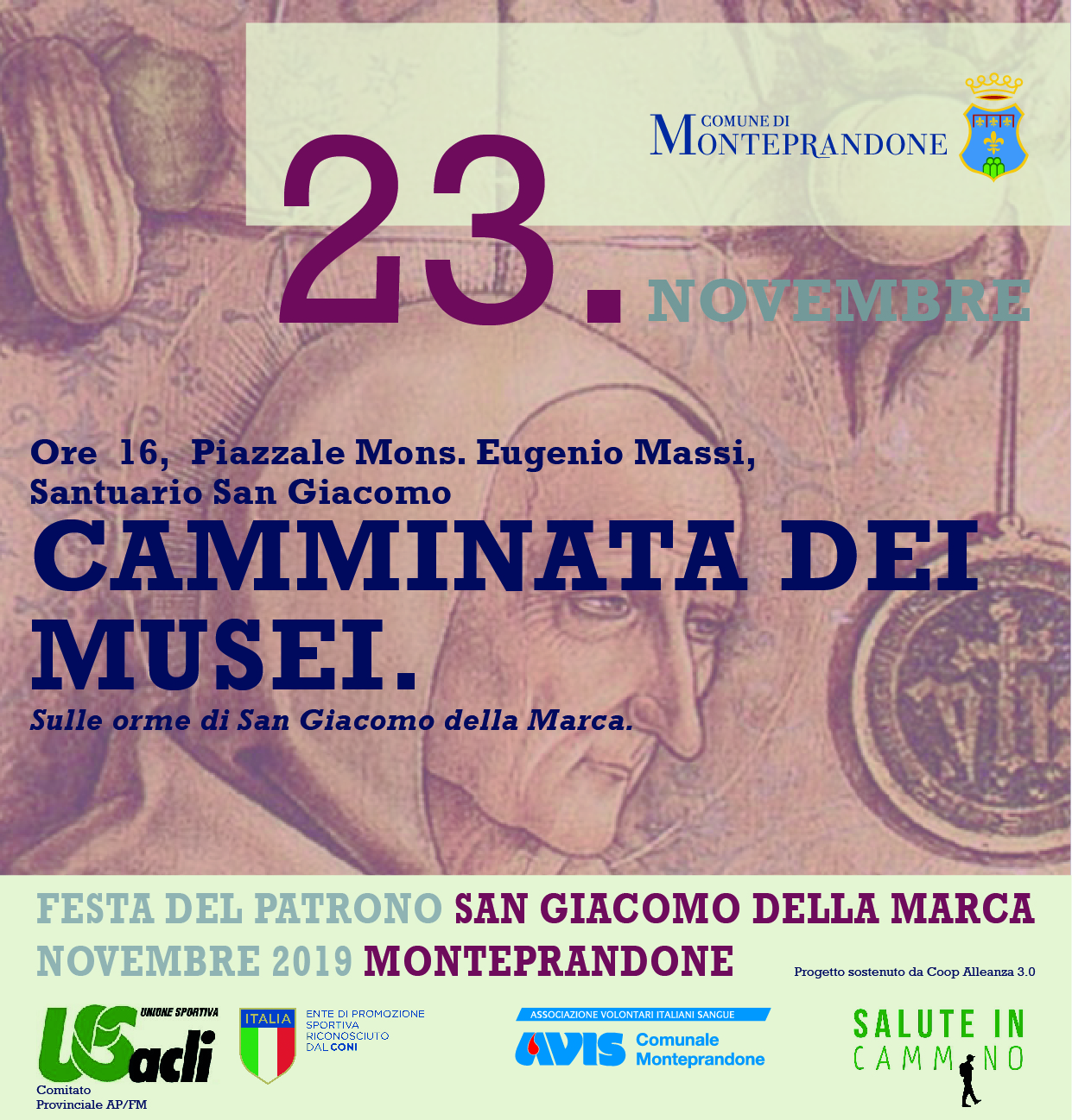 Dalle ore 16 sarà possibile ripercorrere le orme del Santo partecipando alla camminata dei musei. Una passeggiata non competitiva dal Santuario al Centro Storico, con una visita ai musei del territorio: Museo dei Codici di San Giacomo e Museo parrocchiale di Arte Sacra nel Centro Storico, Museo dei Sistino di Arte Sacra presso il Convento. L’evento è organizzato dall’Unione Sportiva Acli Comitato provinciale di Ascoli Piceno, in collaborazione con l’Avis Monteprandone.