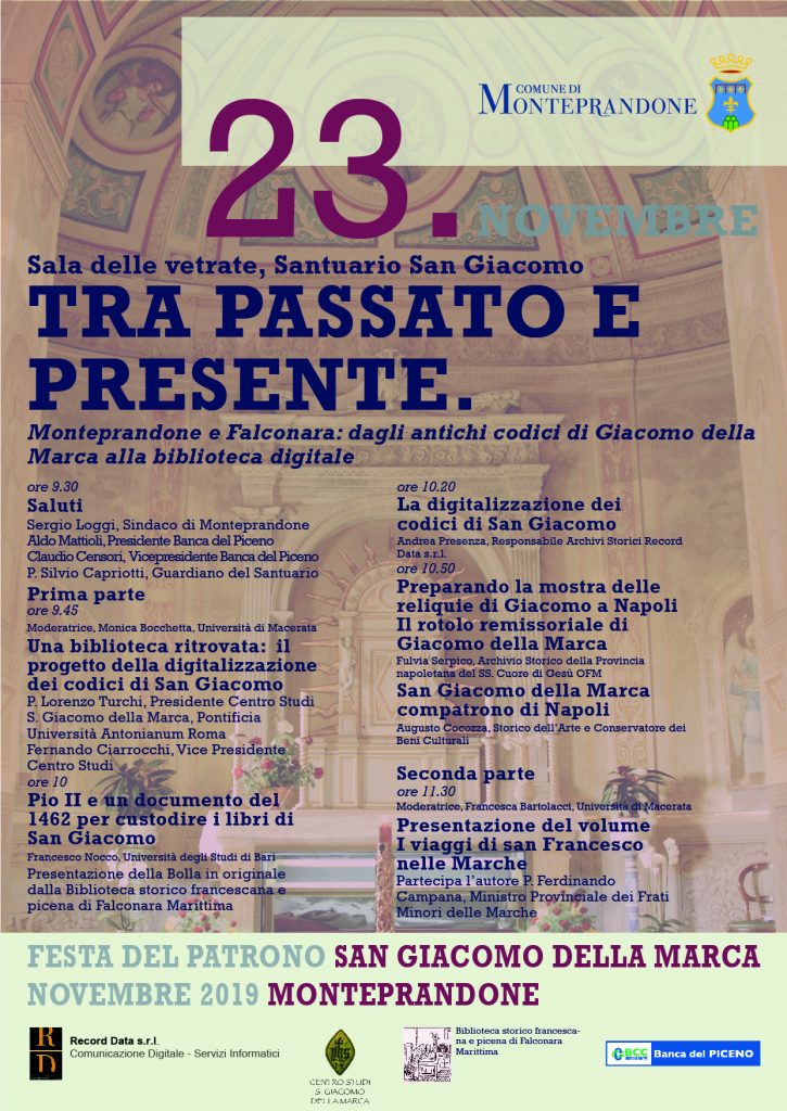 Nella mattinata il Centro Studi San Giacomo della Marca ha organizzato un convegno dal titolo “Tra passato e presente. Monteprandone e Falconara: dagli antichi codici di Giacomo della Marca alla biblioteca digitale”. L’incontro in programma nella sala delle vetrate del Santuario, si aprirà alle 9,30 con i saluti del sindaco Sergio Loggi, del presidente Aldo Mattioli e del vicepresidente Claudio Censori della Banca del Pieno e di Padre Silvio Capriotti Guardiano del Santuario.