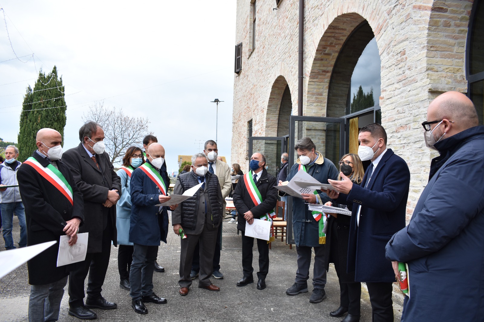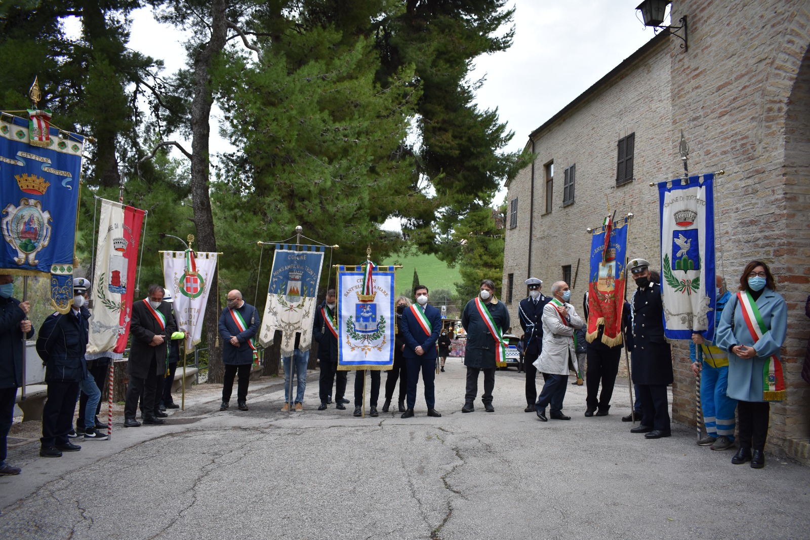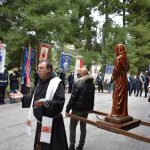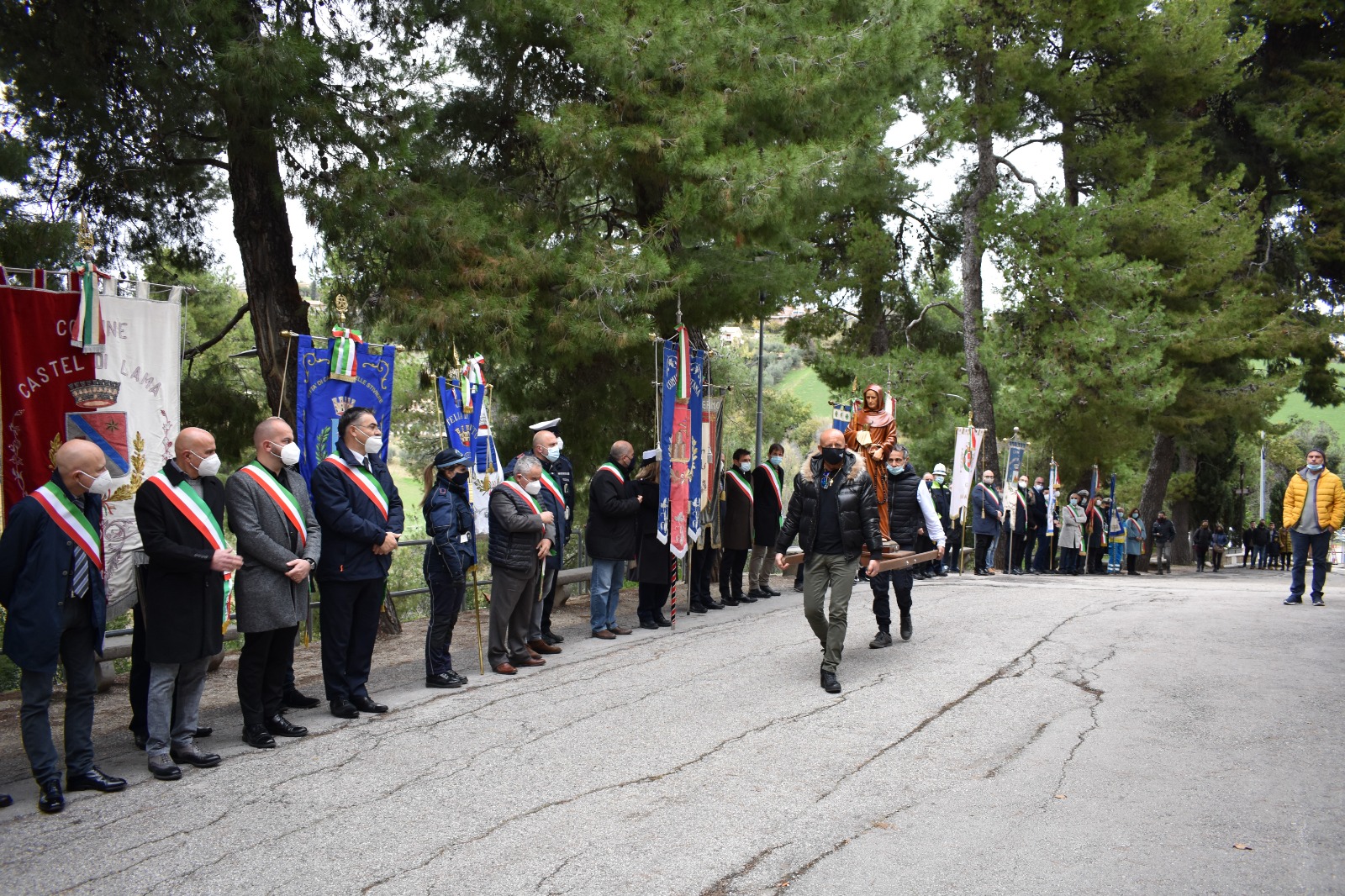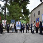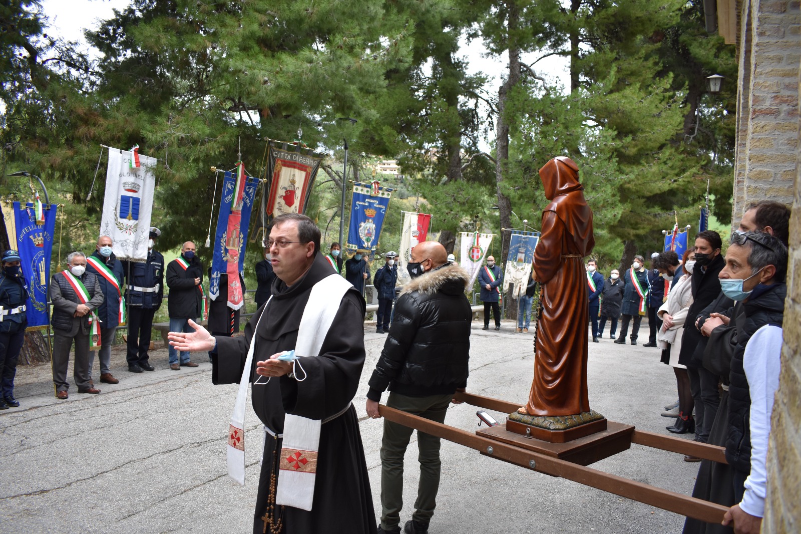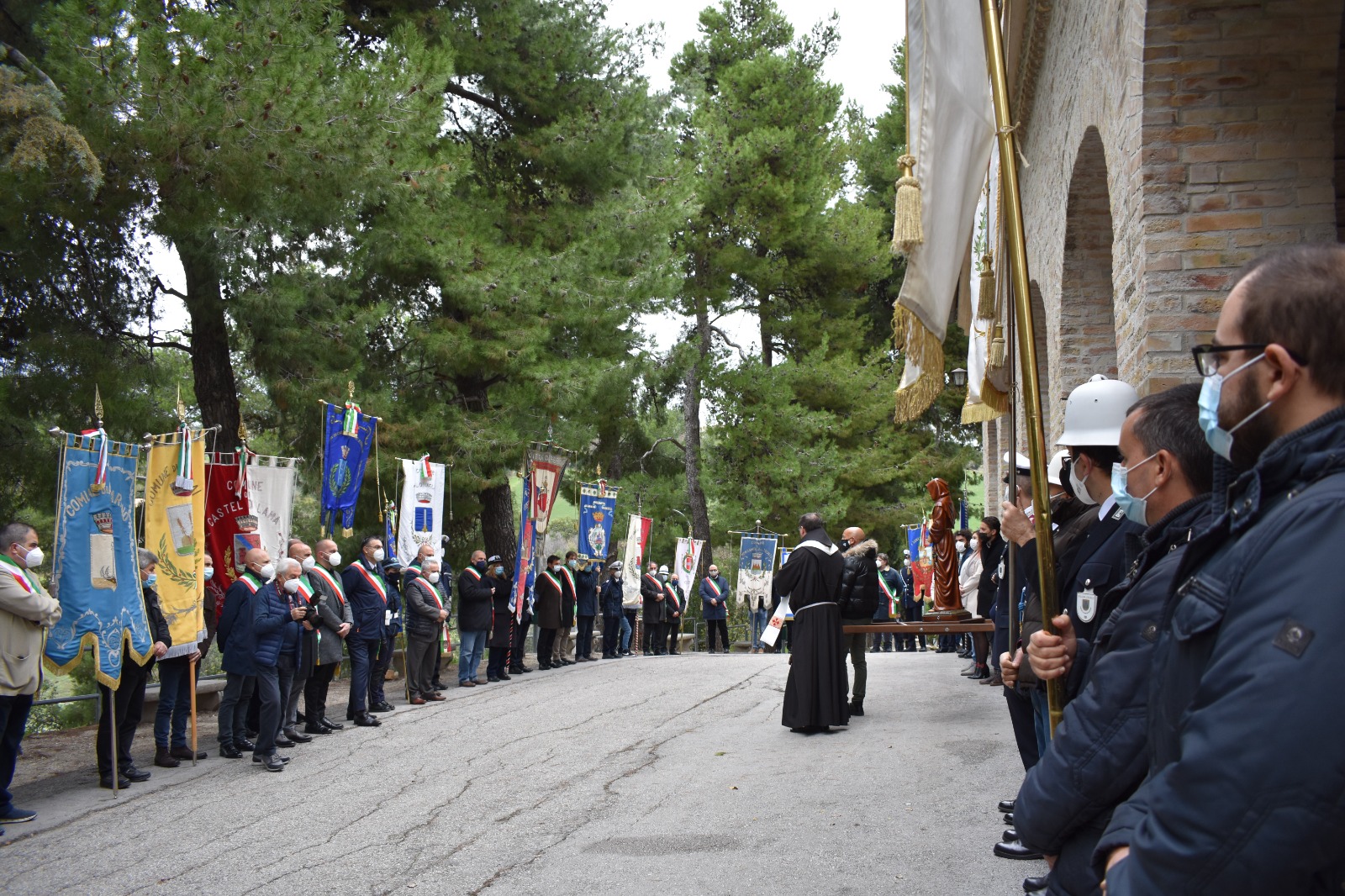 Prima dell’ingresso in chiesa, la statua del Santo è stata portata in processione sul piazzale del Convento, dove erano schierati i Sindaci con rispettivi Gonfaloni dei Comuni che fanno parte della Rete delle Città di San Giacomo della Marca.