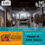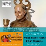 Nelle giornate di sabato 20 e 27 novembre e di domenica 21 e 28 novembre sono aperti e visitabili gratuitamente il Museo di Arte Sacra nel Centro Storico e il Museo Sistino di San Giacomo della Marca presso il Convento e le mostre “Venti anni del rientro delle spoglie del Santo a Monteprandone” via Limbo e mostra “Lunatica” presso lo SpaziomOHOc curata da Nazareno Luciani.