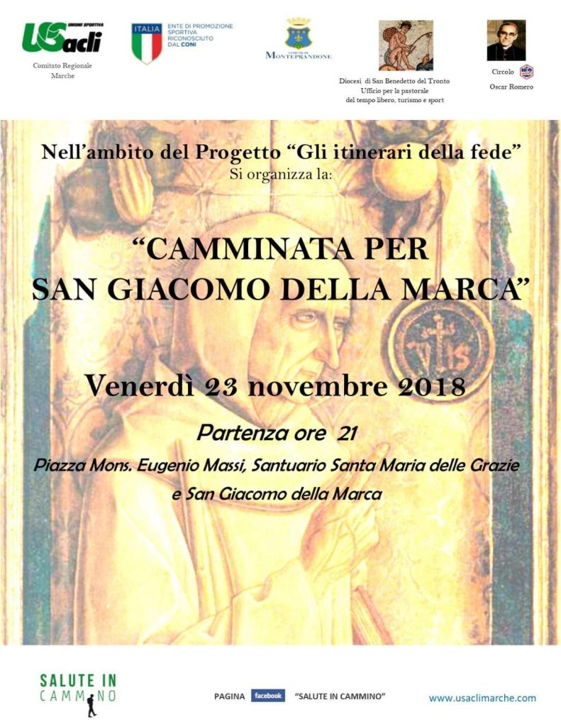 Si parte venerdì 23 novembre con la Camminata per San Giacomo della Marca, organizzata dell’associazione UsAcli Marche, in collaborazione con Circolo Acli Oscar Romero e Ufficio per la pastorale del tempo libero, turismo e sport della Diocesi di San Benedetto del Tronto, Ripatransone e Montalto delle Marche. Partenza ore 21 in piazza Mons. Eugenio Massi al Santuario Santa Maria delle Grazie e San Giacomo della Marca. A seguire il gruppo dei podisti si recherà a Monteprandone fino alla casa natale del patrono.