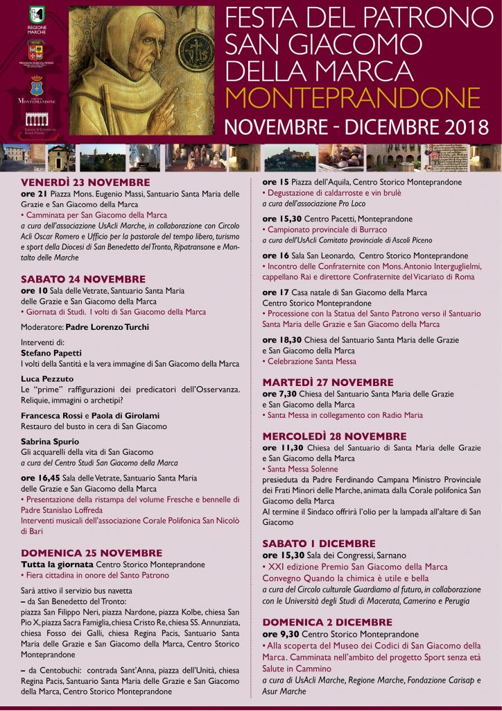 Al via i festeggiamenti di San Giacomo della Marca Patrono di Monteprandone. Il calendario promosso dall’Amministrazione comunale in collaborazione con il Centro Studi San Giacomo della Marca, la Pro Loco di Monteprandone, l’associazione San Giacomo della Marca e Santa Maria delle Grazie, il Circolo Culturale Guardiamo al Futuro di Sarnano, i Frati Minori del Santuario Santa Maria delle Grazie e San Giacomo della Marca, le parrocchie del territorio, comprende iniziative civili e religiose. Il programma gode del patrocinio della Regione Marche, della Provincia di Ascoli Piceno e della Banca del Piceno e di patrocinio e contributo della Camera di Commercio di Ascoli Piceno.
