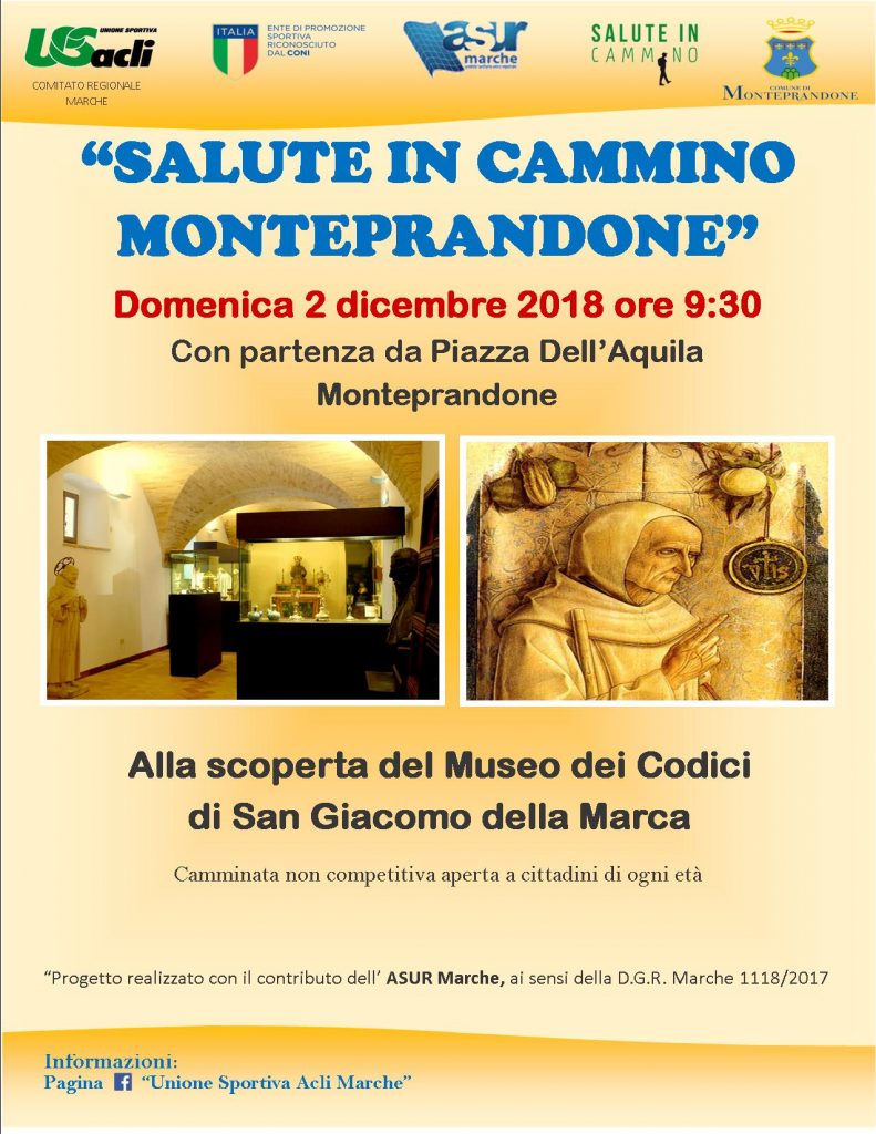 Ultimo appuntamento domenica 2 dicembre con la camminata “Alla scoperta del Museo dei Codici di San Giacomo della Marca”. Inserita nell’ambito del progetto “Sport senza età. Salute in Cammino” e curata da UsAcli Marche, Regione Marche, Fondazione Carisap e Asur Marche, partirà alle ore 9.30 da piazza dell'Aquila nel Centro Storico Monteprandone prevede una camminata nel centro storico aperta a cittadini di ogni età ed una visita guidata alle strutture museali ed alle bellezze architettoniche di Monteprandone. La partecipazione è gratuita e per iscriversi basta presentarsi sul luogo di partenza 15 minuti prima del via per la registrazione dei dati anagrafici.