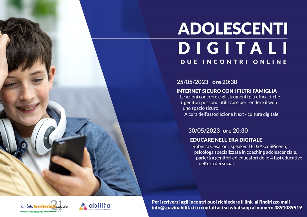 SI SEGNALANO I PRIMI DUE INCONTRI ON LINE DEL LABORATORIO ADOLESCENTI DIGITALI 25/05/2023 E 30/05/2023 ALLE ORE 20.30