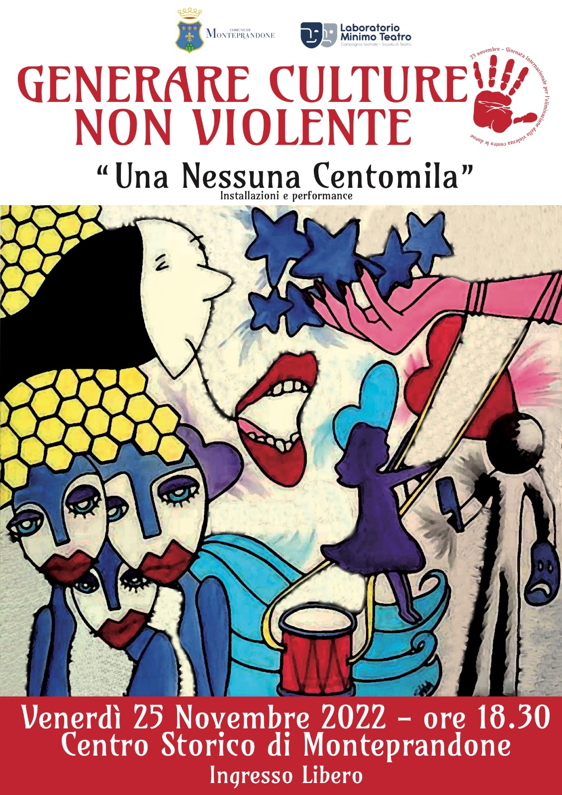 “Generare culture non violente” è il titolo dell’iniziativa organizzata dal Comune di Monteprandone, in collaborazione con l’associazione Laboratorio Minimo teatro, le lettrici e i lettori volontari Nati per Leggere della Provincia di Ascoli Piceno con il patrocinio e il sostegno del Dipartimento per le Pari Opportunità della Presidenza del Consiglio dei Ministri, in occasione del 25 novembre “Giornata internazionale per l'eliminazione della violenza contro le donne”.