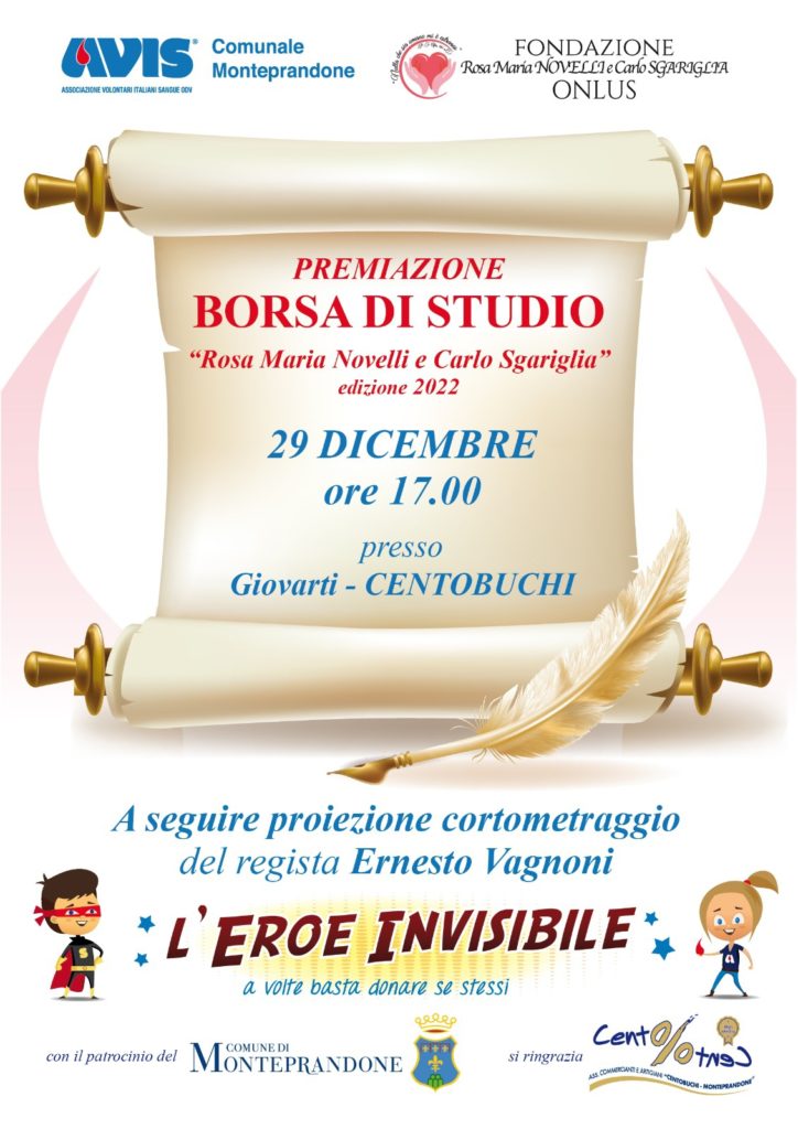Giovedì 29 Dicembre, nella salaaudiocinema del Giovarti, alle ore 17 verranno premiati i ragazzi che hanno partecipato alla terza edizione del Contest organizzato dall’Avis Comunale di Monteprandone e dalla fondazione Rosa Maria Novelli e Carlo Sgariglia Onlus, con il patrocinio del Comune di Monteprandone.
