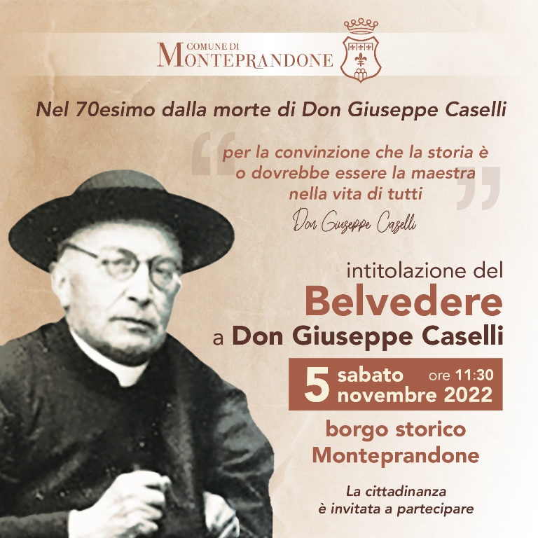 In occasione del 70esimo anniversario dalla morte di Don Giuseppe Caselli, il Comune di Monteprandone rende omaggio al parroco con l’apposizione di una targa commemorativa presso il Belvedere nel Borgo Storico che è stato a lui recentemente intitolato con una deliberazione della Giunta comunale.