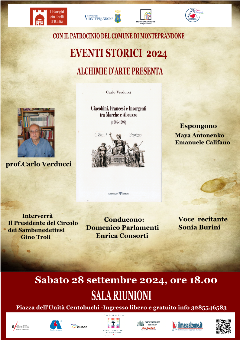 Per la rassegna storica di Alchimie d’Arte 2024 ci sarà Carlo Verducci e la sua ultima opera Storica dal titolo “Giacobini, Francesi e Insorgenti tra Marche e Abruzzo” (1796-1799), Andrea Livi editore.