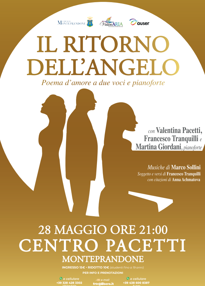 Domenica 28 maggio, alle 21, all’Auditorium Centro Pacetti, torna in scena “Il Ritorno dell’Angelo”, poema d’amore a due voci e pianoforte di Francesco Tranquilli, su musiche di Marco Sollini, con Valentina Pacetti e Martina Giordani al pianoforte, a cura dell’Associazione MultiCulturale VisionAria, in collaborazione con l’Associazione Auser e il patrocinio del Comune di Monteprandone.