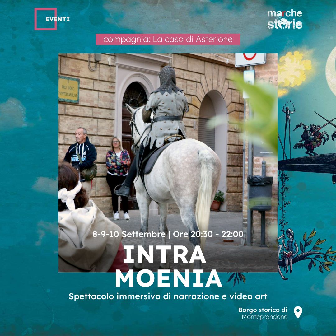 “Intra Moenia” è il titolo dello spettacolo immersivo di narrazione e video art. portato in scena da La Casa di Asterione. Prendendo spunto dalle gesta eroiche del cavalier Prandone, lo spettacolo è una riflessione ironica e sarcastica sul potere e sulle dinamiche che da esso scaturiscono. I cavalieri hanno da sempre combattuto per la giustizia, il coraggio e la libertà, ma oggi che senso hanno queste parole? Quali sono i valori per i quali vale la pena combattere oggi? Queste le domande rivolte alle persone incontrate nella prima fase di ricerca e che sono state il punto di partenza per la drammaturgia. Attraverso l’utilizzo delle cuffie Silent Emotion, la performance si snoda per le vie del paese accompagnando il pubblico in un viaggio acustico e sensoriale. Al racconto teatrale si alternano frammenti video dove i protagonisti sono proprio i cittadini di Monteprandone. La combinazione di questi elementi rende lo spettacolo ironico e surreale. Lo spettacolo si terrà venerdì, sabato e domenica, alle ore 20:30 e alle ore 22. Evento gratuito su prenotazione al link