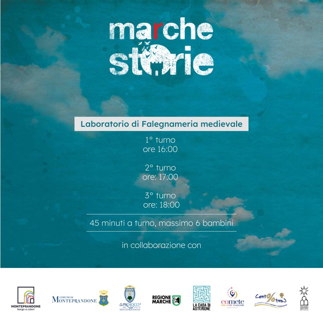 Durante MarcheStorie si andrà anche “A caccia di storie con il Cavalier Prandone” con gli incontri di letture condivise e promozione della lettura in famiglia per bambini e bambine in età prescolare curati dai volontari e dalle volontarie Nati per Leggere della Provincia di Ascoli Piceno, dalle educatrici del Nido Comunale in collaborazione con la cooperativa Pagefha, con il patrocinio del Comune di Monteprandone. Gli appuntamenti gratuiti, rivolti alle famiglie, ai bambini e alle bambine da 0 a 6 anni, si terranno: venerdì 8 settembre a Palazzo Parissi e domenica 10 settembre, al Museo dei Codici di San Giacomo, dalle 18:30 alle 19:30. La prenotazione è obbligatoria ai seguenti numeri 339.5031923 (Serena), 348.3109398 (Chiara).