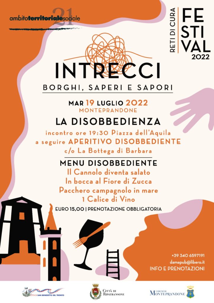 Martedì 19 luglio, alle 19.30, piazza dell’Aquila di Monteprandone ospiterà l’iniziativa “Intrecci: borghi, saperi e sapori”, organizzato dall’Ambito Territoriale Sociale 21 con il patrocinio del Comune di Monteprandone. L’evento si pone l’obiettivo di offrire ai partecipanti un momento di incontro dedicato alla riflessione e all’introspezione su dei temi predefiniti, ma senza vincolarli a uno specifico spaccato della sfera umana, e con il contributo di esperti psicologi.